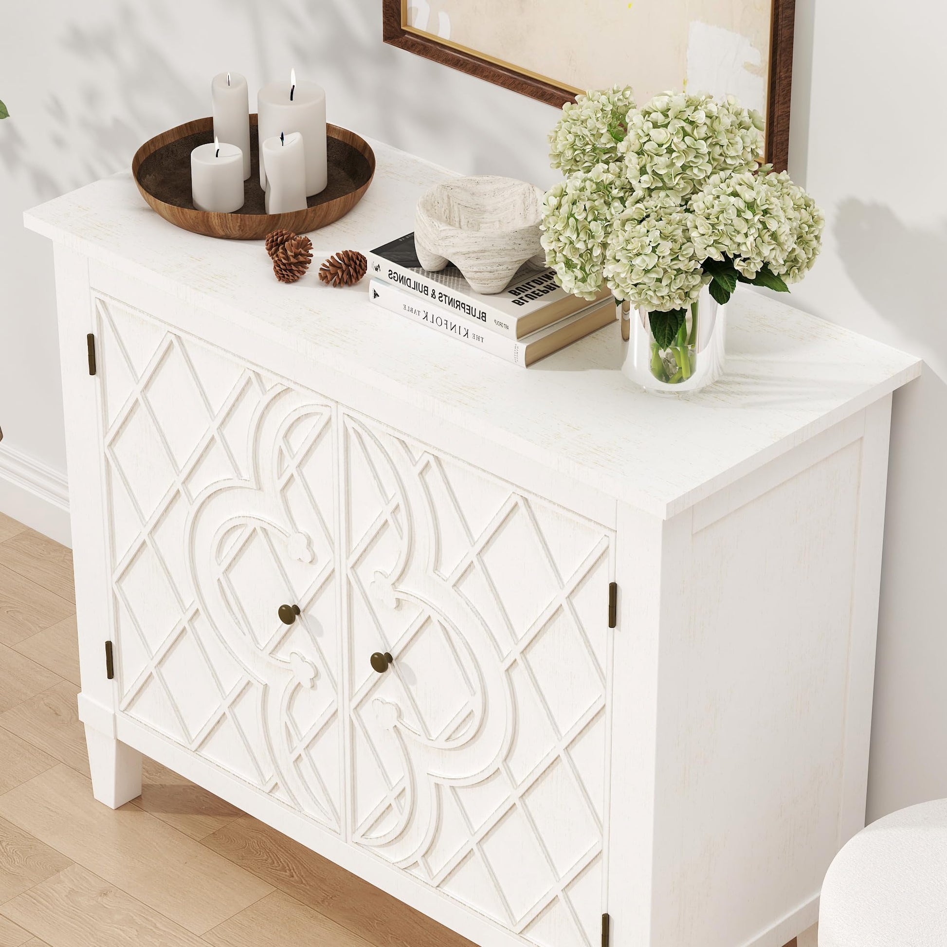 - Handmade Distressed Craftsmanship: This white sideboard buffet cabinet is hand-polishing, antique rubbing and other processes, and painted, finishes with charming embossed motifs on the door panels, it seamlessly blends vintage charm with mid century modern decor, that complements any decorative style