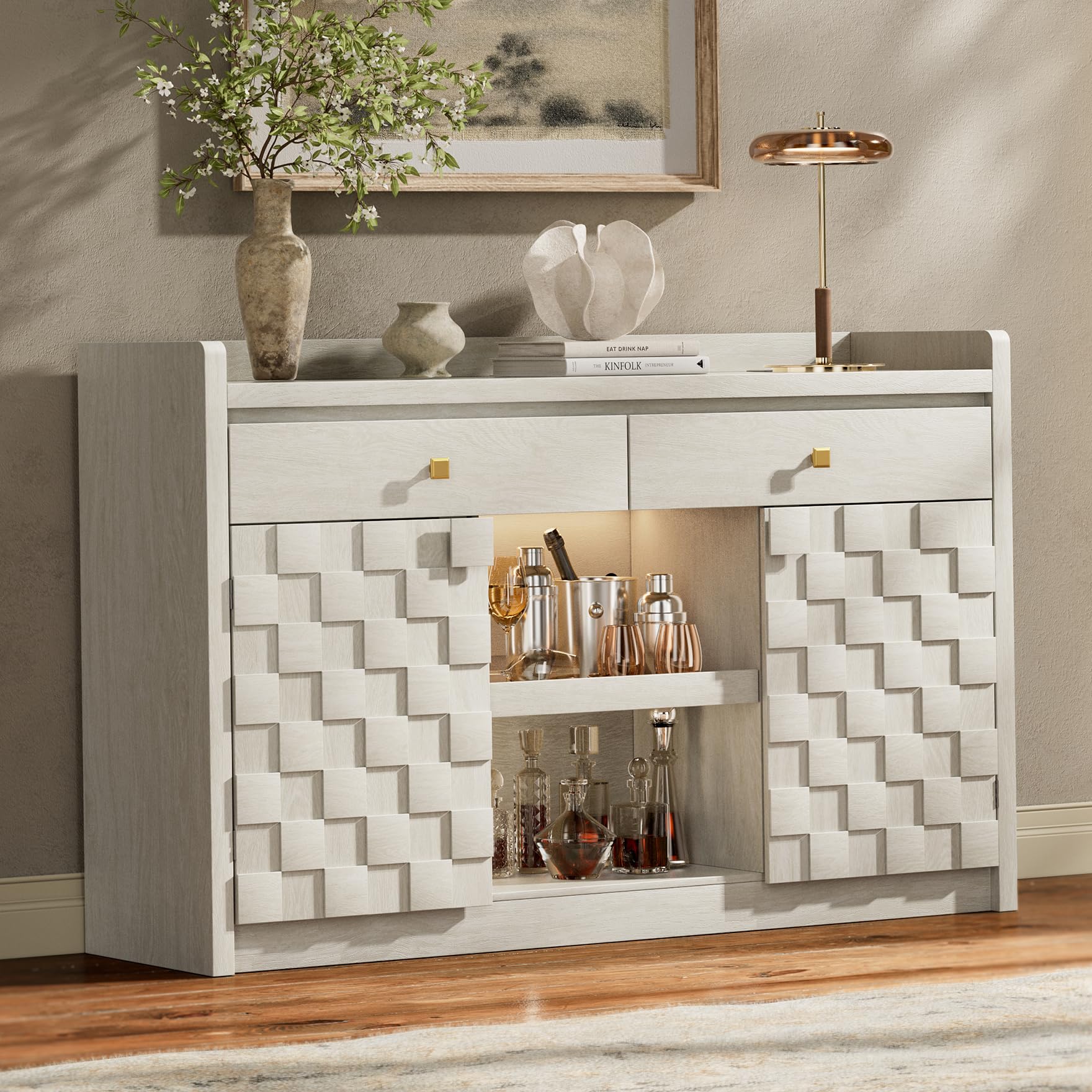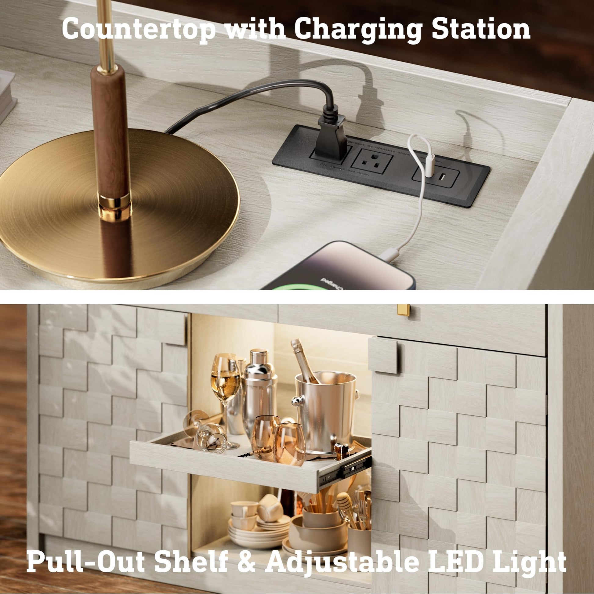 • Charging Station & LED Light: This sideboard buffet cabinet with 2 AC outlets and 2 USB ports, so you can easily plug in small kitchen appliances. The sideboard cabinet features a 3-color adjustable LED light strip to create the perfect ambiance and make it easy to see and access your stored items.