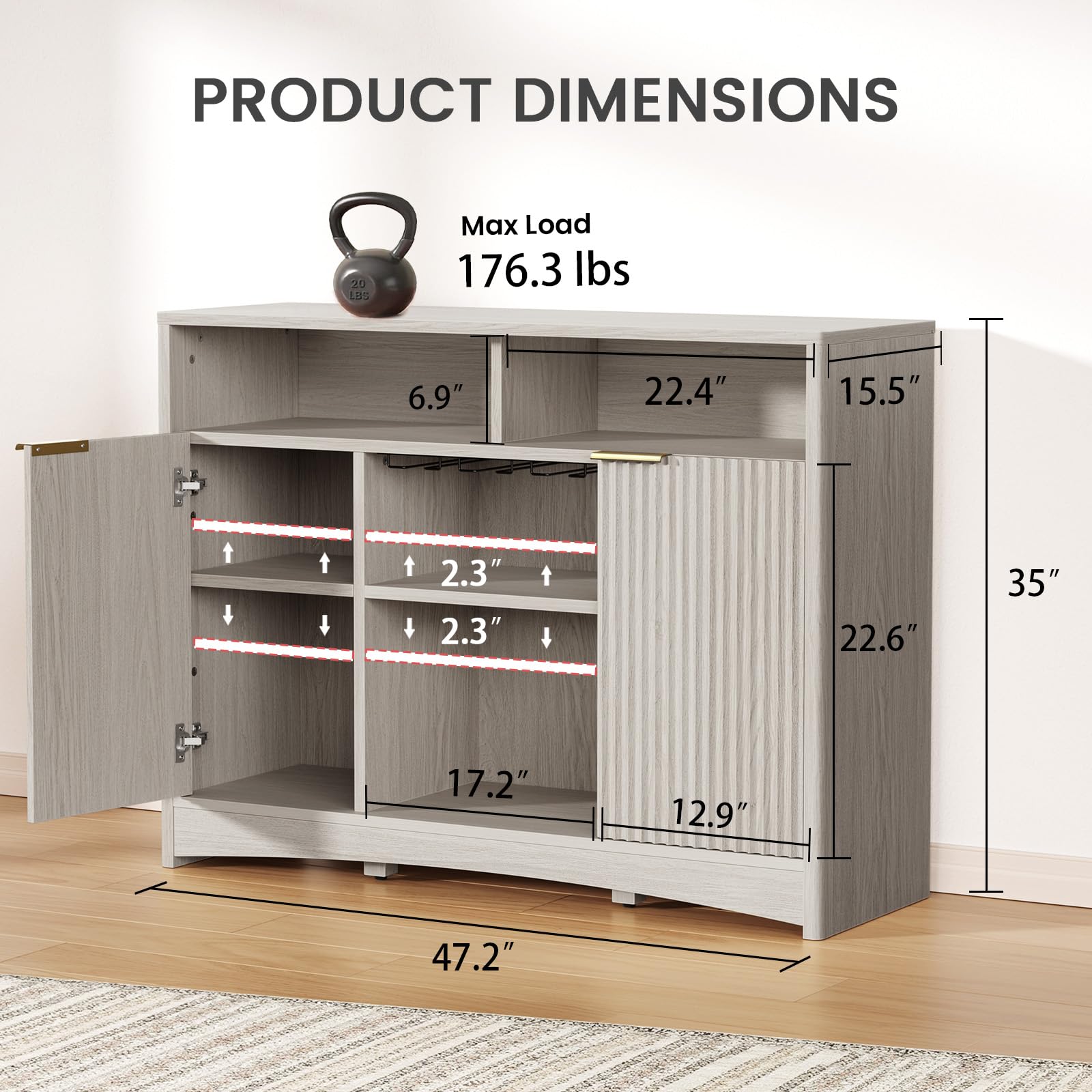 • MODERN STYLE & MULTI-PURPOSE DESIGN:Measuring 47.2" W × 15.5" D × 35" H, this elegant cabinet with gold-tone handles fits any décor. Use as a coffee bar, buffet, sideboard, or wine cabinet—one piece, endless possibilities.