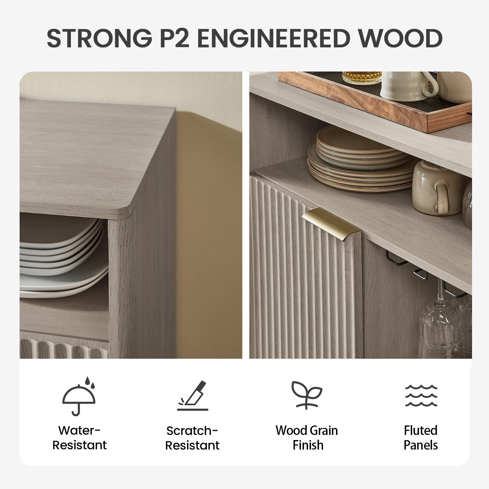 • DURABLE BUILD & EASY MAINTENANCE:Crafted from sturdy engineered wood with a refined finish, this sideboard is built to last and simple to clean—perfect for everyday use while keeping your space stylish and functional.