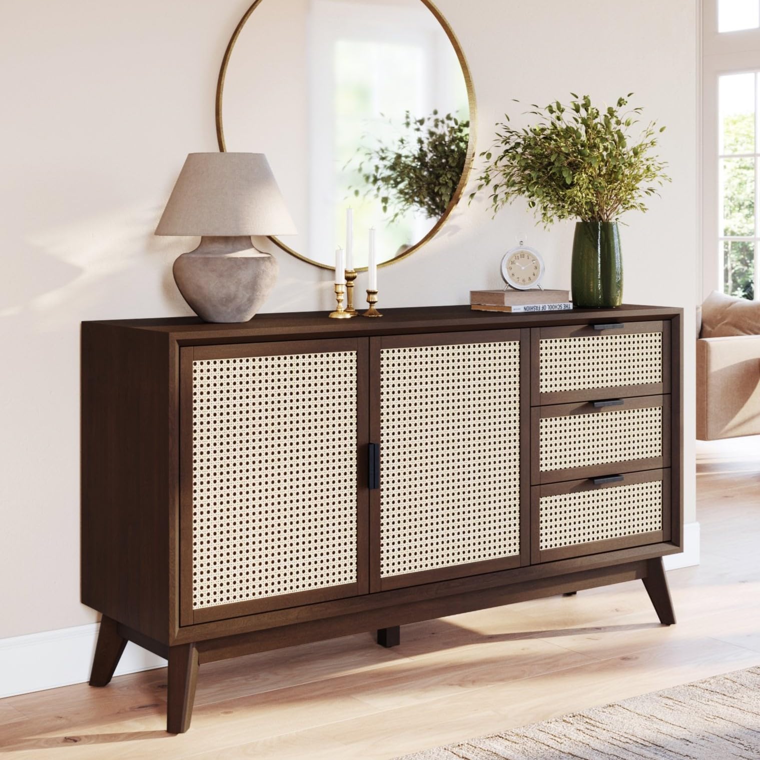 Details: The Jasper sideboard, an exquisite addition from our Jasper Collection. Crafted with precision and designed for versatility, this buffet cabinet seamlessly marries contemporary elegance with mid-century charm, promising a timeless allure that complements any interior. About the cabinet: - Our sideboard cabinet effortlessly embodies a harmonious fusion of mid-century charm and modern sophistication. Crafted with clean lines and rustic details, this rattan storage cabinet brings a touch of cozy warmth to your space. - Built with a stable and sturdy structure, our buffet cabinet with storage boasts solid wood legs with adjustable levelers, ensuring long-lasting use. - Our entryway table with storage features flexible storage options with removable and adjustable shelves behind two doors and three large drawers to accommodate all your needs. - Boasting an impressive capacity, the rattan cabinet with doors supports up to 286 lbs, the shelves within the sideboard doors can handle 33 lbs each, and the three full-extension drawers provide sturdy storage with a capacity of 99 lbs each. - Our rattan buffet cabinet comes 90% pre-assembled. Just attach the legs to the frame, and your sideboard is ready to use in under 10 minutes.