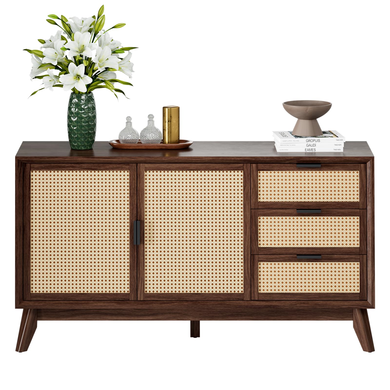 **58" Rattan Buffet Sideboard with 3 Drawers and 2 Doors, Pre-Assembled Accent Console Table for Living Room, Kitchen, or Dining, Walnut**