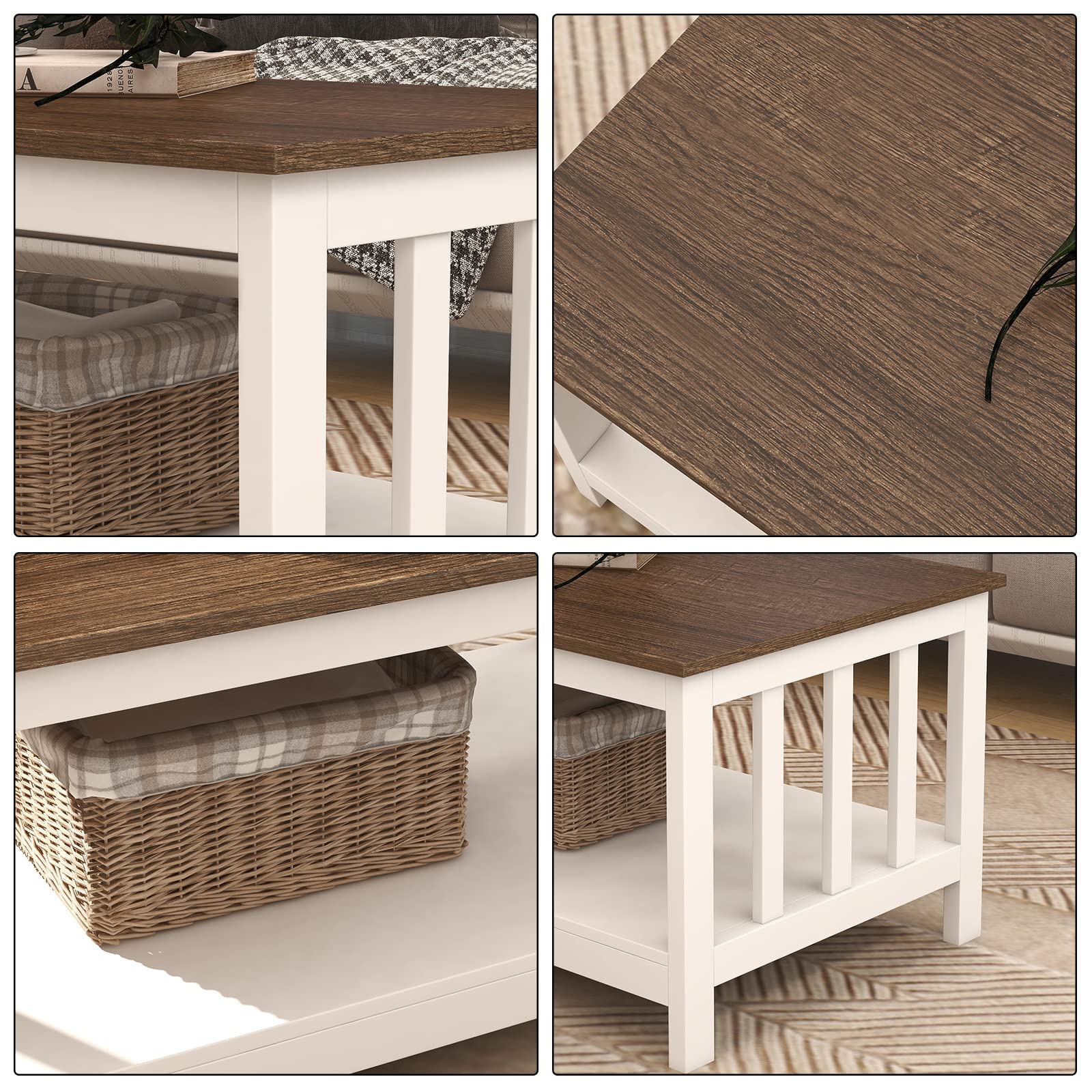 White Farmhouse Coffee Table with Shelf, 40 Inch Living Room Table