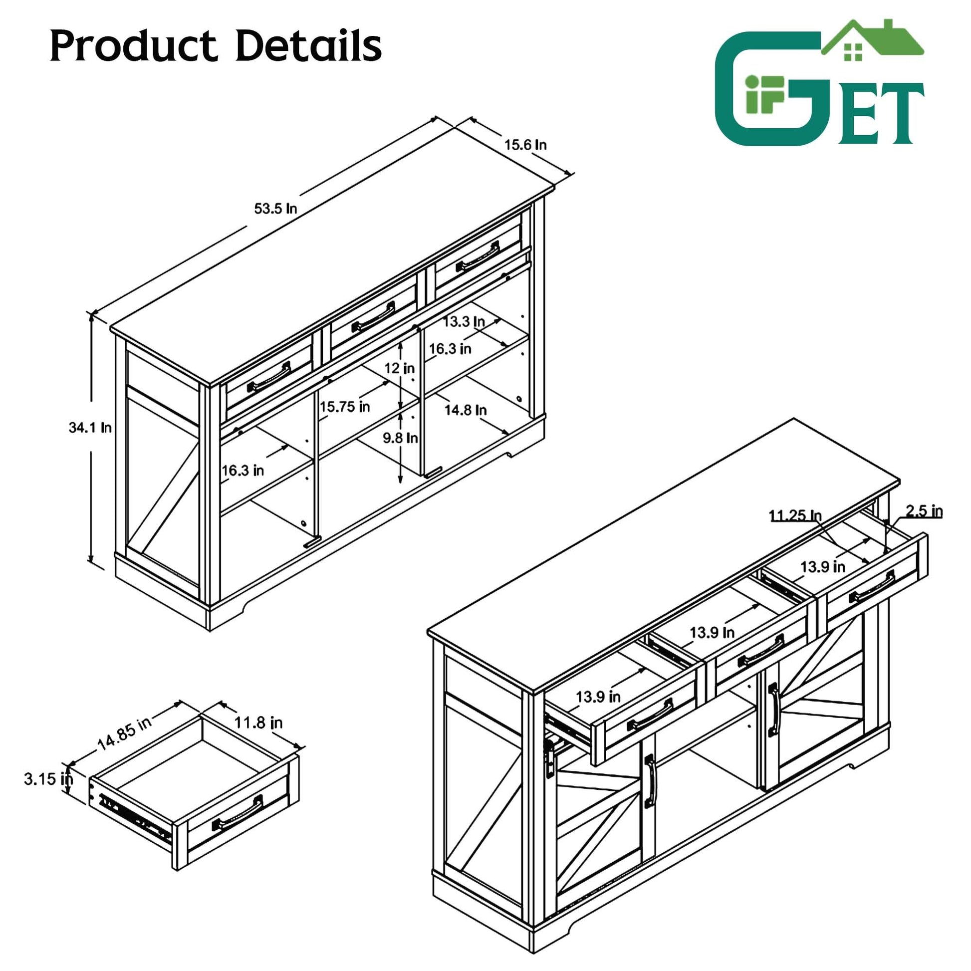 • Ample Storage Space: The three convenient drawers of this classic American Farmhouse style sideboard add endless convenience and storage options. They offer ample space to organize and store various items while ensuring your privacy. Whether it's dinnerware, linens, or other accessories, these three drawers provide effortless storage and convenient accessibility, making your home more tidy, functional, and stylish