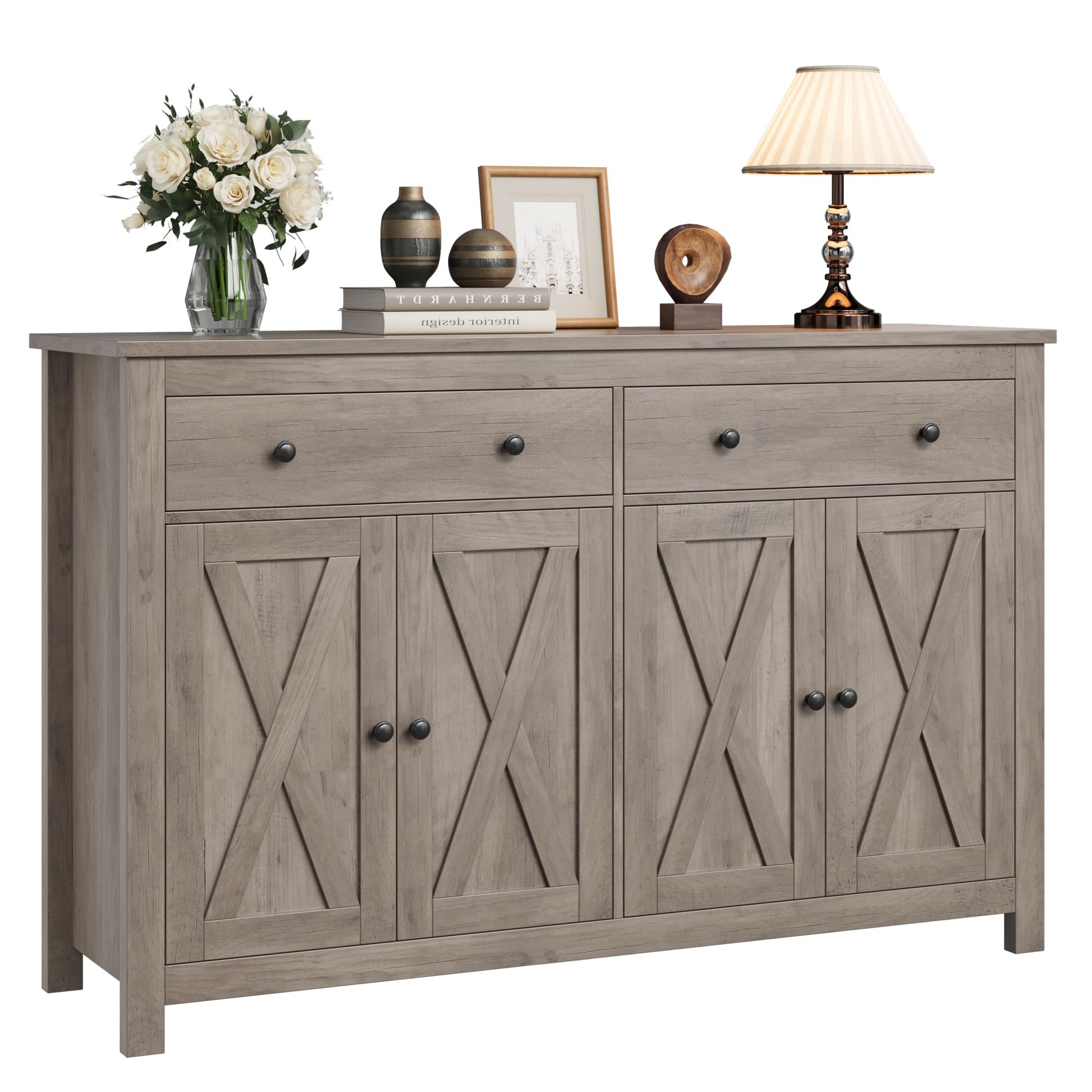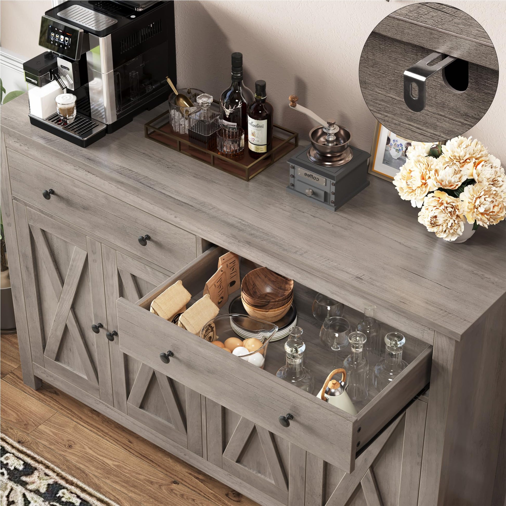 - Modern Style--Farmhouse tabletop with wooden grain and distressed vintage metal handle of this grey buffet cabinet, adds a great farmhouse flair to your home. Together with grey barn doors, this kitchen storage cabinet blends modern stylish elements with a distressed vintage look, to create a charming storage solution that matches most home decor.