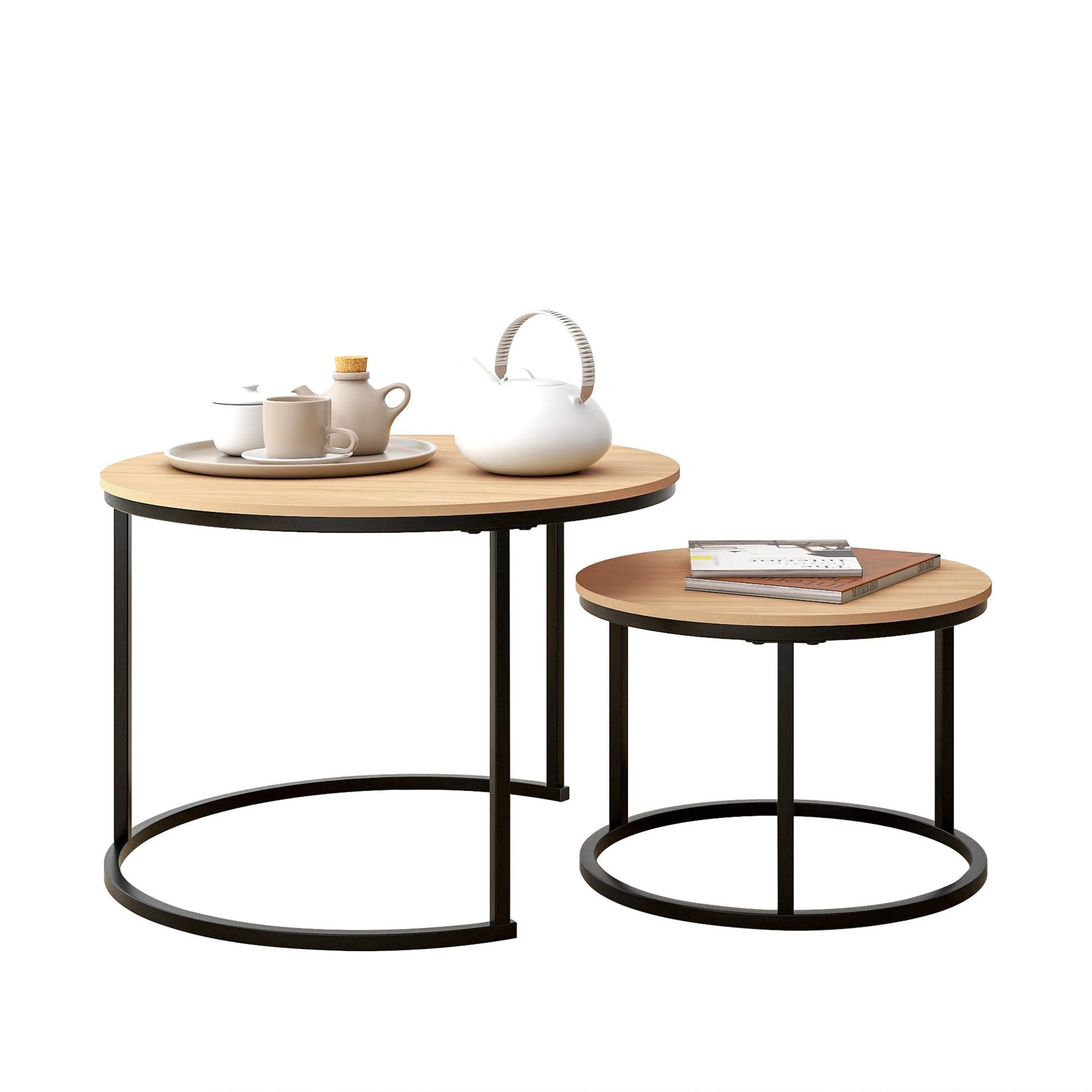 Industrial Round Coffee Table Set of 2, Stacking Side Tables with Wood-Look Top and Metal Frame for Living Room, Black/Teak