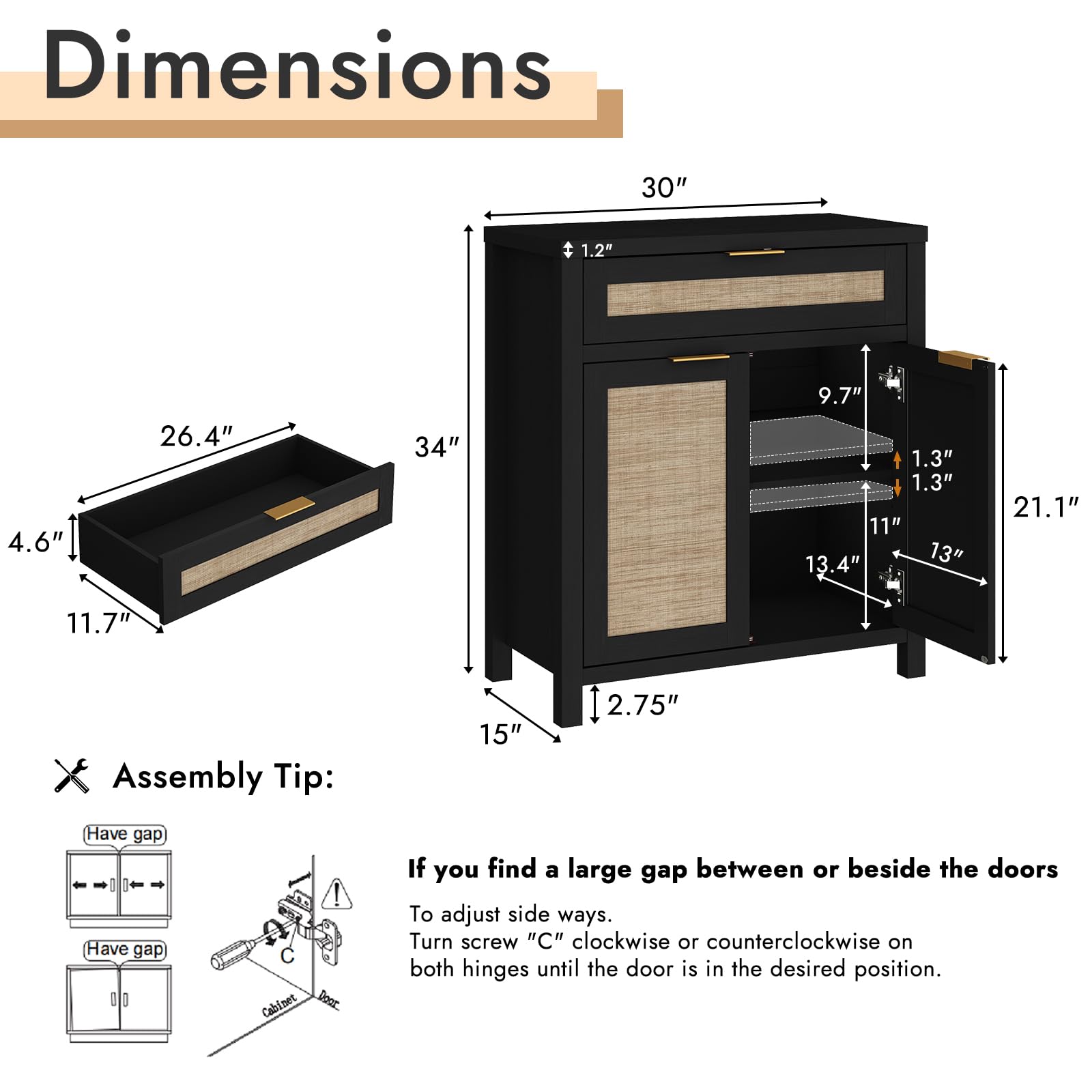 Boho Rattan Sideboard Buffet Cabinet with Doors and Drawer, Farmhouse Storage Credenza with Adjustable Shelf for Living Room, Hallway, or Kitchen, Black