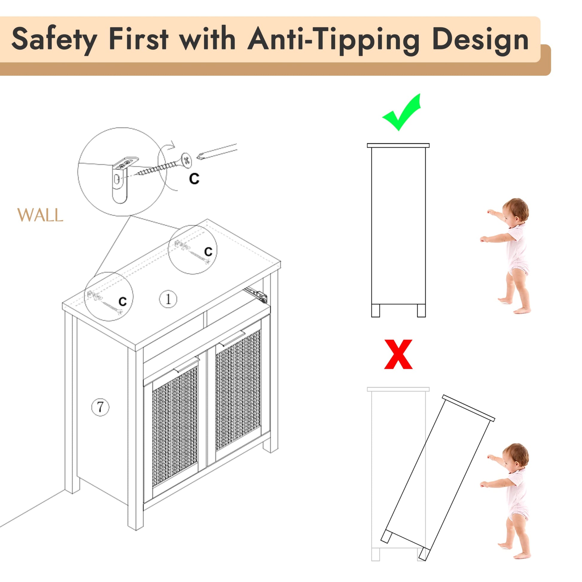 • Easy to Assemble-Our rattan cabinet comes with easy-to-follow instructions, complete with illustrations and clearly marked parts. All screws are individually labeled and packed in separate bags for quick identification. For added security, please secure the console cabinet to the wall using the included anti-tip kits.