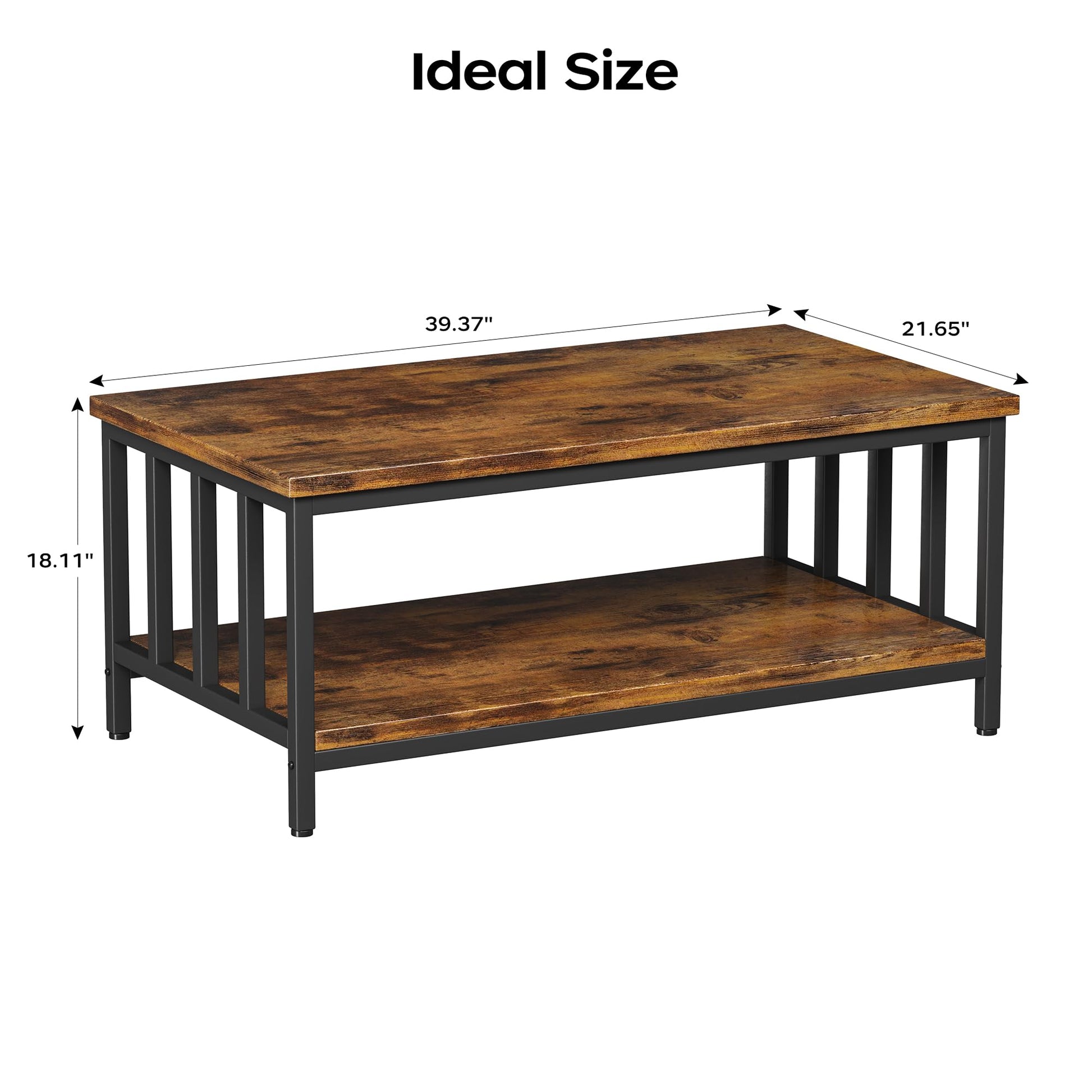 - 【Excellent Material】Constructed with high-quality MDF board and a sturdy metal frame, this coffee table is built with a rational structure for long-lasting stability. Overall Dimensions: 21.65”D x 39.37”W x 18.11”H; Weight Capacity: Up to 130 pounds for each shelf.