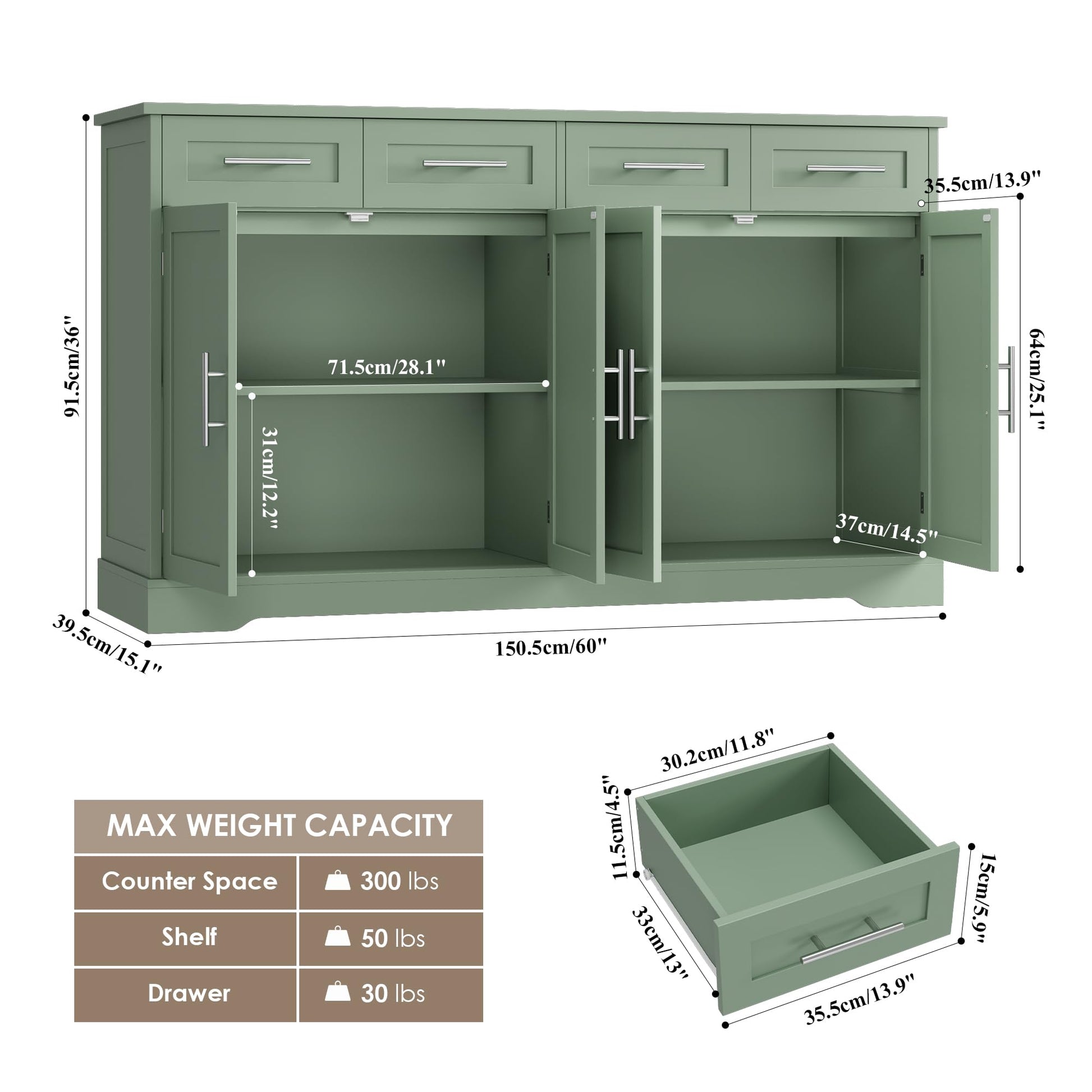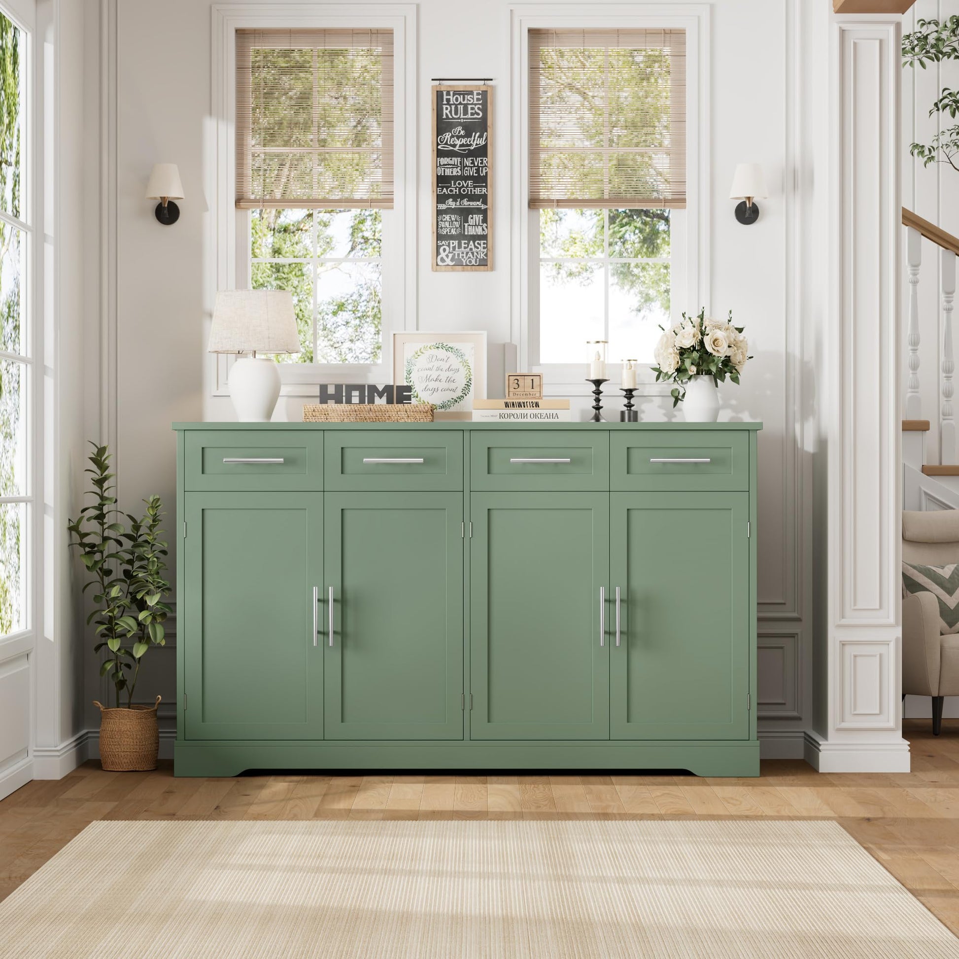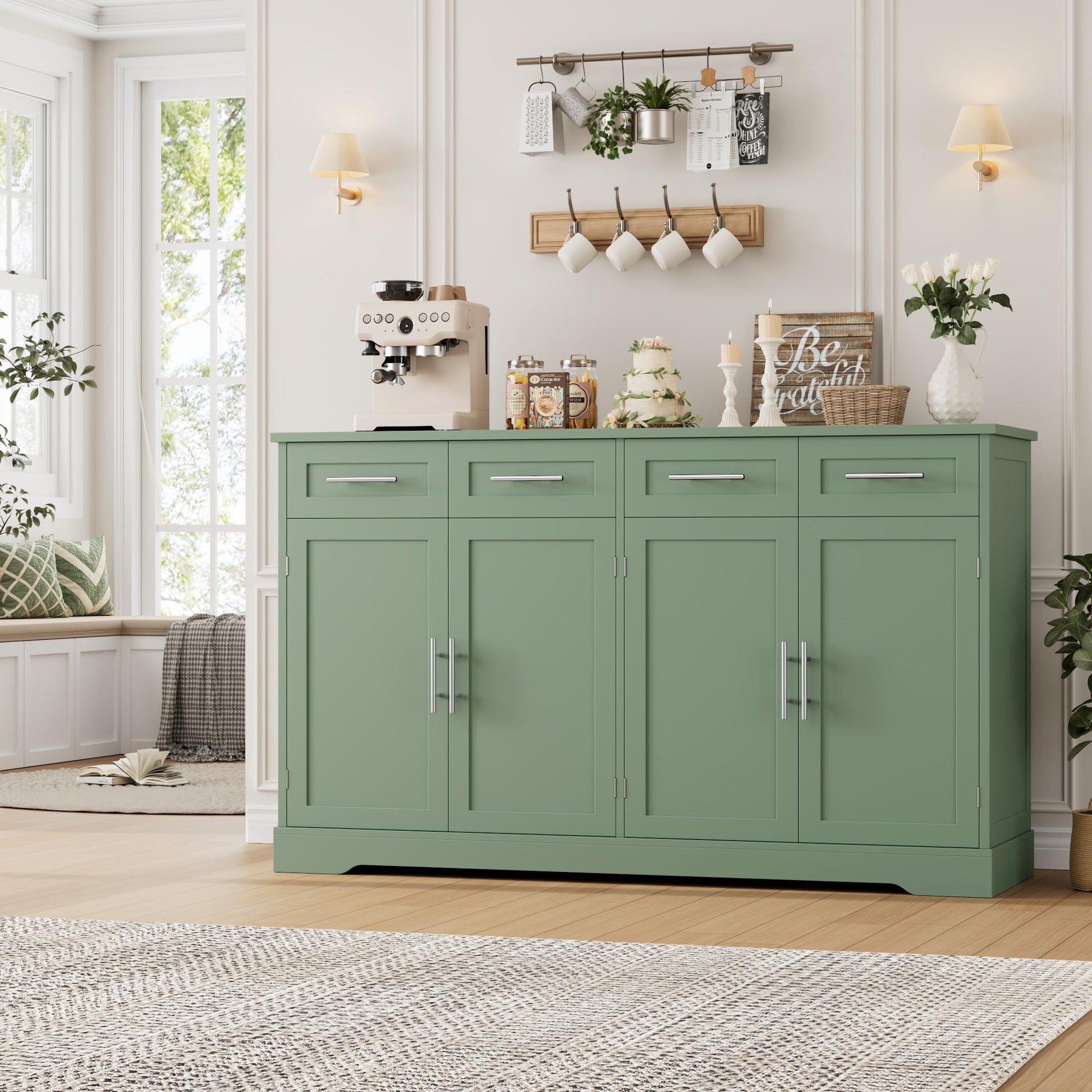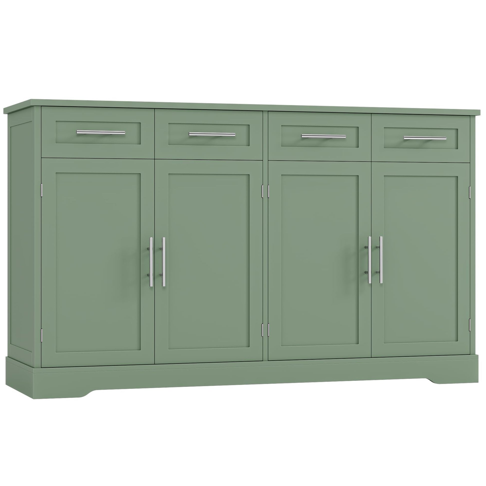 60" Large Buffet Sideboard with 4 Drawers and Storage, 36" Tall Modern Kitchen Cabinet with Gold Handles, Green