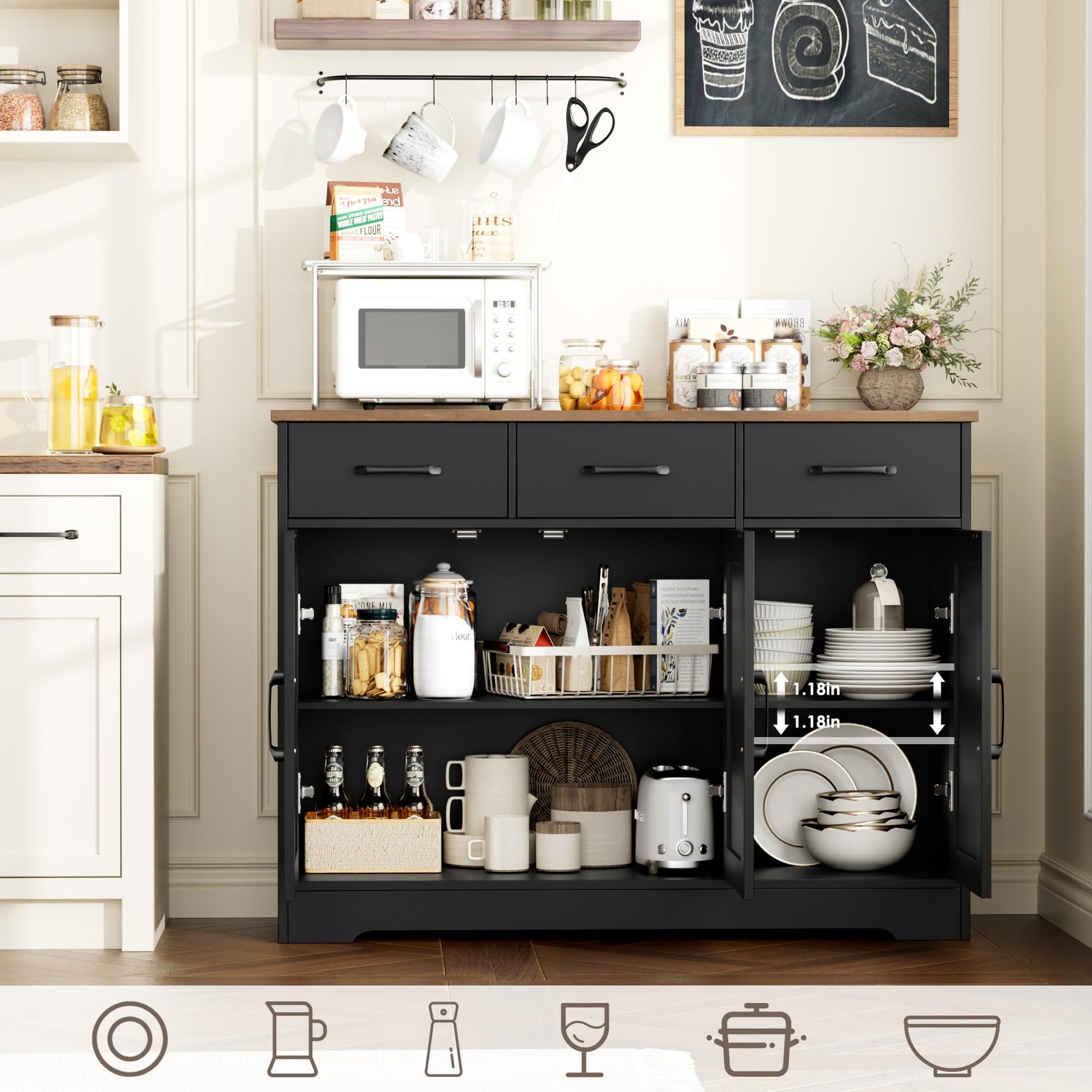 • Ample Storage Space: The buffet cabinet incorporates both open and closed storage space to meet your different needs. Spacious tabletop can place items for easy access, three handy drawers help classify knives and forks neatly, while two bottom cabinets each with internal shelf offer smart space to accommodate mugs, extra dishware, and other essentials