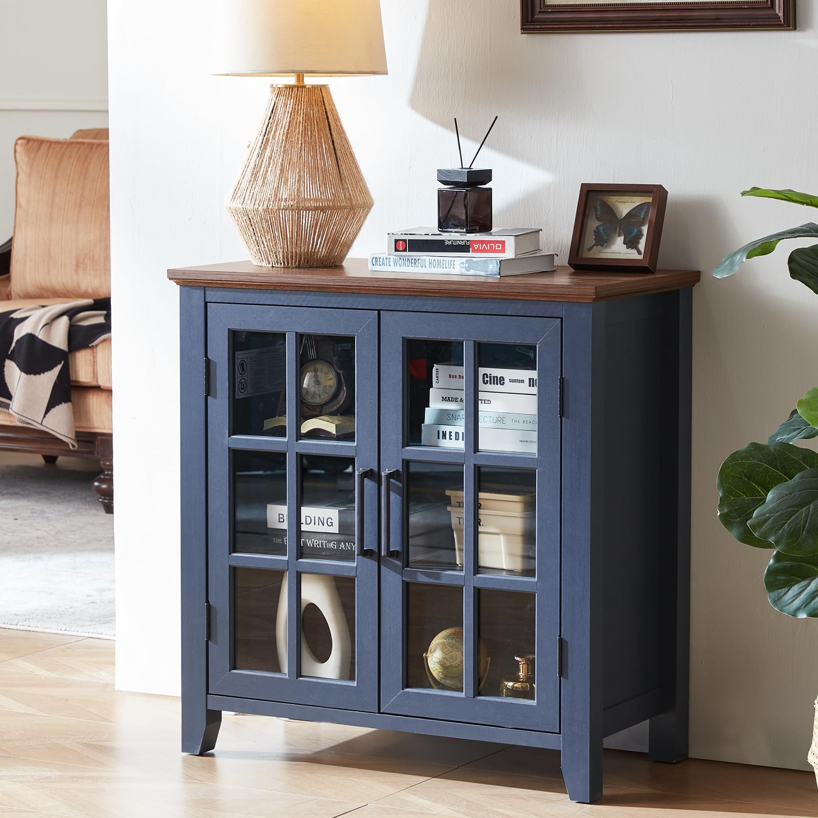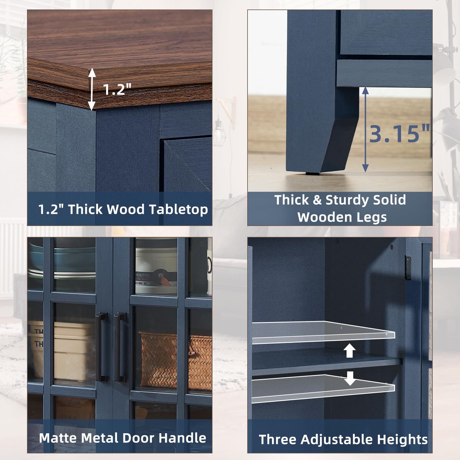 **32" Large Farmhouse Sideboard Buffet Cabinet with Storage, Wood Coffee & Wine Bar Cabinet with 2 Glass Doors, Mid-Century Modern Sideboard for Dining Room or Living Room, Navy Blue**
