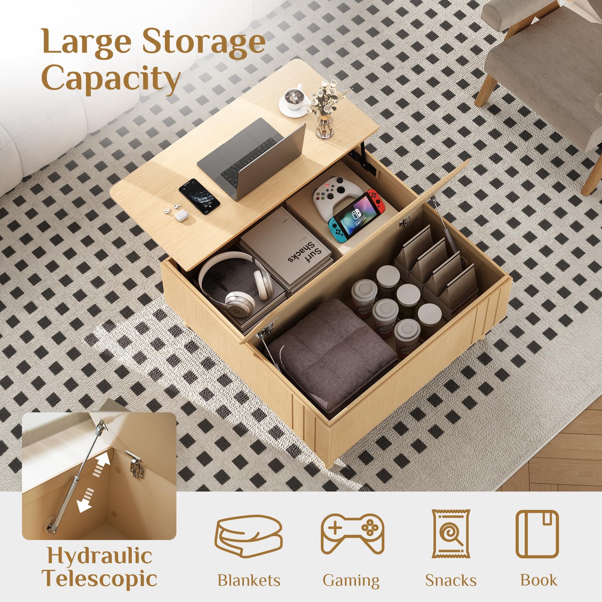 • Lift Top Design Combined with Versatility: The lift top coffee table adopts a stable lifting design and versatility,providing a convenient space for dining,gaming or using a laptop.It is a must-have choice for those who pay attention to the versatility of furniture