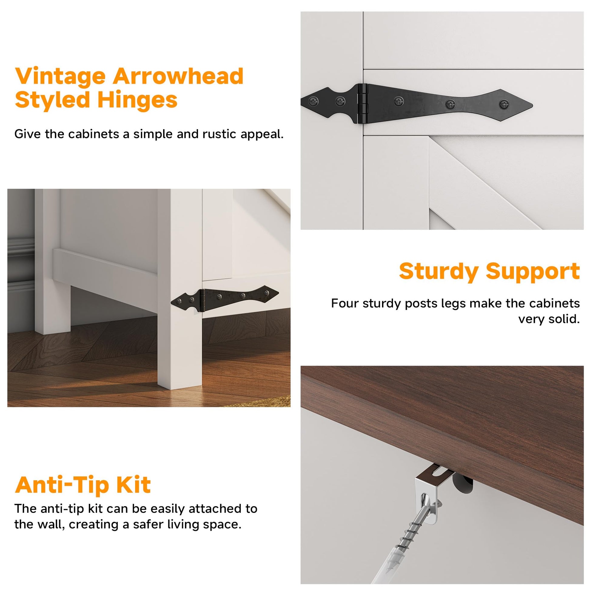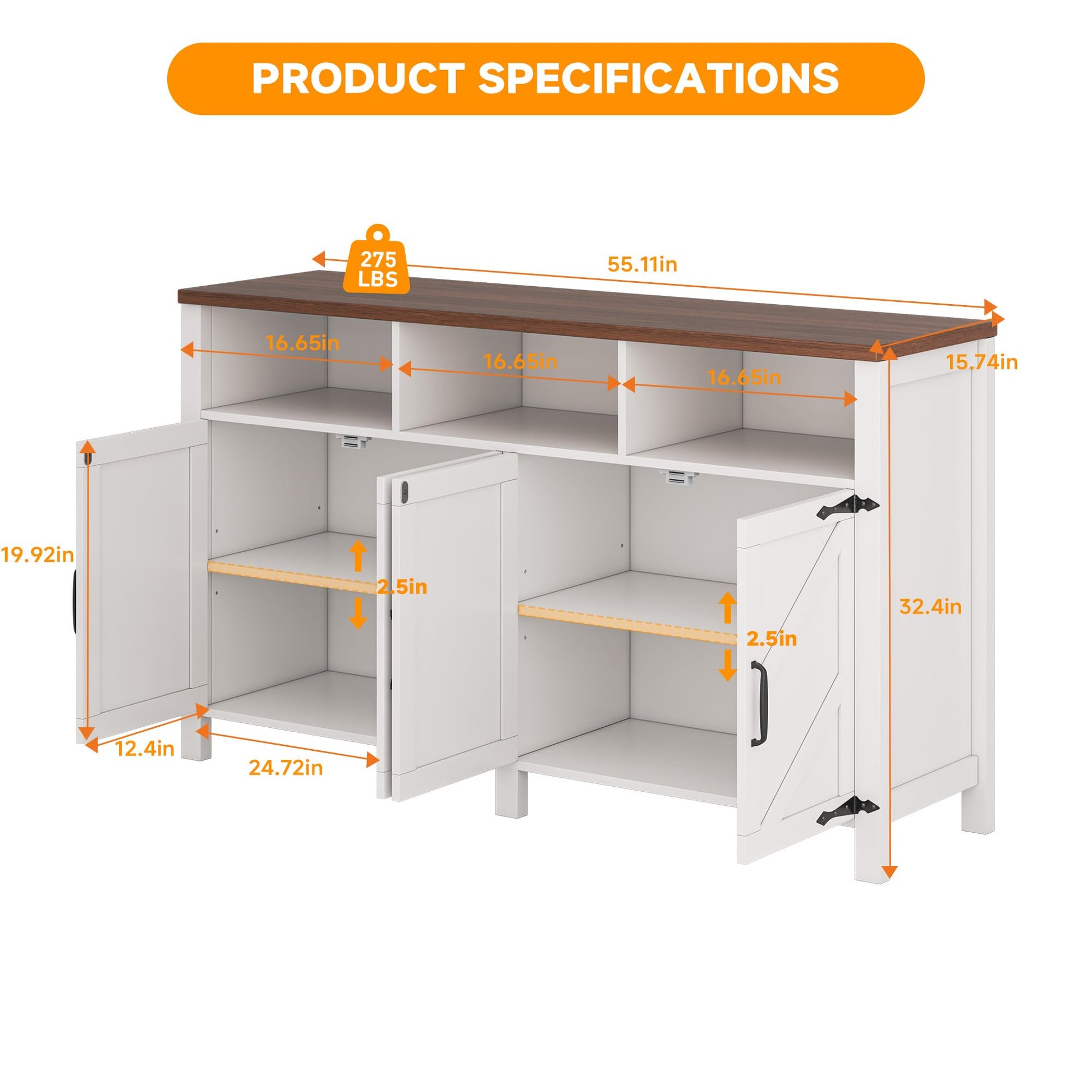 - Stylish & Elegant Design - Rustic walnut tabletop and with classic barn doors of this white buffet cabinet, adds a great farmhouse flair to your home, vintage Arrowhead Styled Hinges give the cabinets a simple and rustic appeal. Blends easily with decor style from traditional to contemporary, modern.