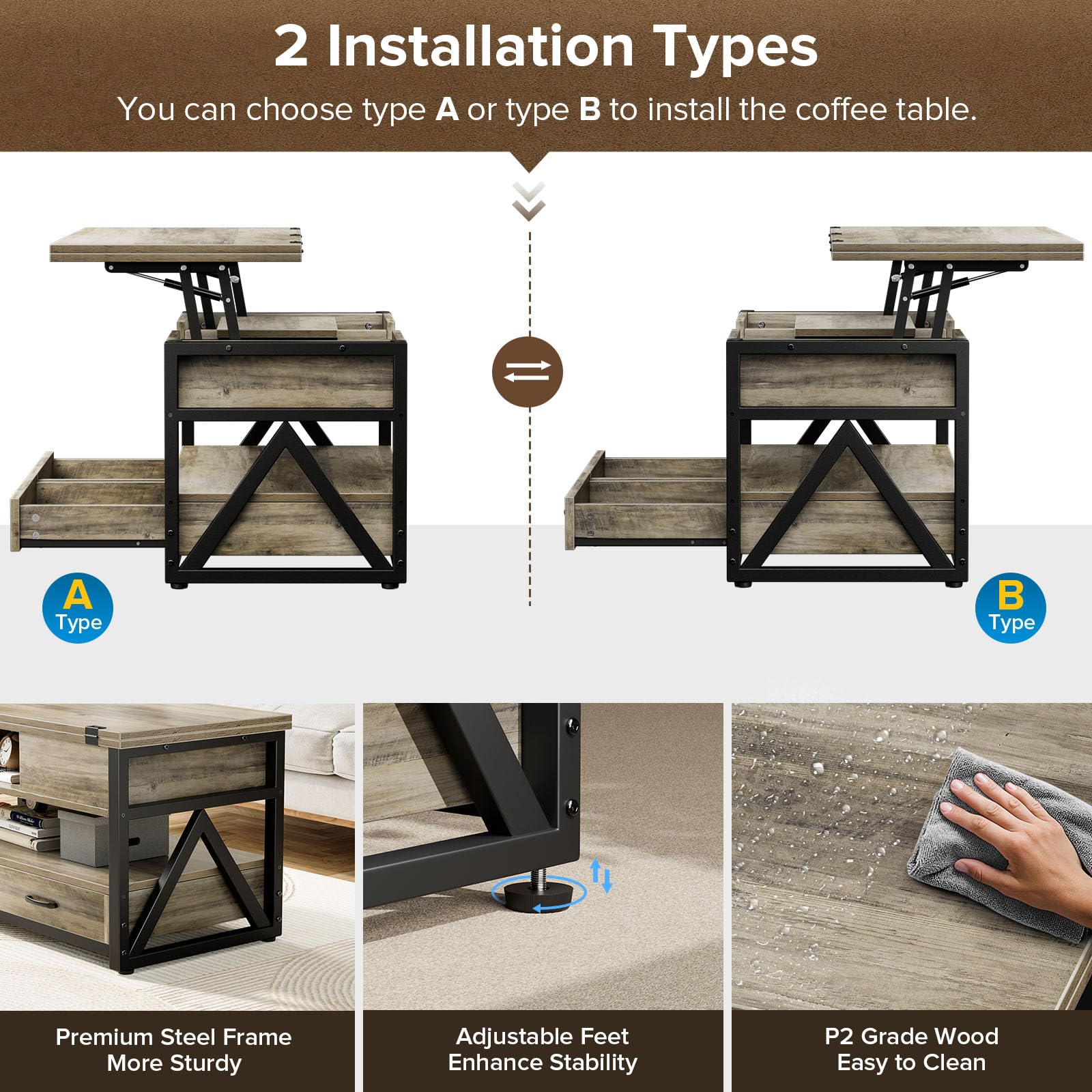 40" Lift Top Coffee Table, 4-in-1 Multi-Functional Farmhouse Coffee Table with Storage Drawers & Hidden Compartment, Lift Tabletop Center Table for Living Room, Grey