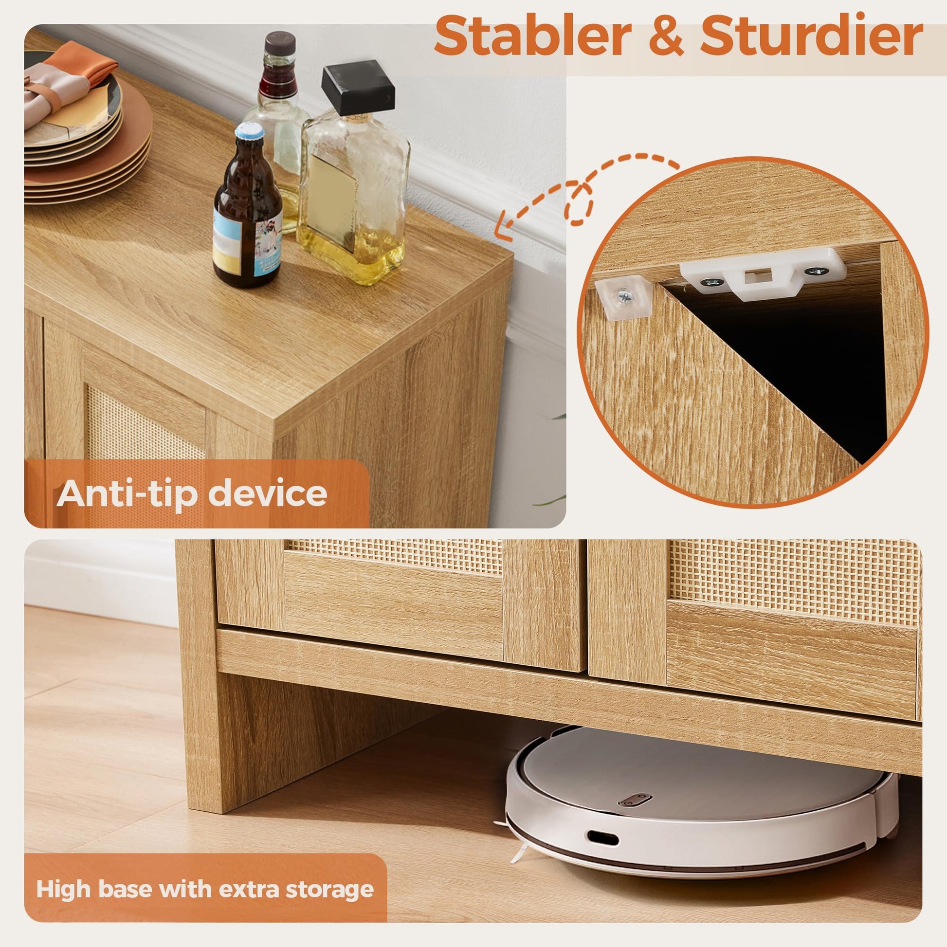 • 【Bohemian design】 This credenza storage cabinet is equipped with 4 design rattan wood doors, kitchen sideboard with black metal handles, adding a unique sense of fashion and charm to the product. The spacious top countertop can be used as a cooking table or to store tableware, etc., keeping the kitchen clean and tidy.