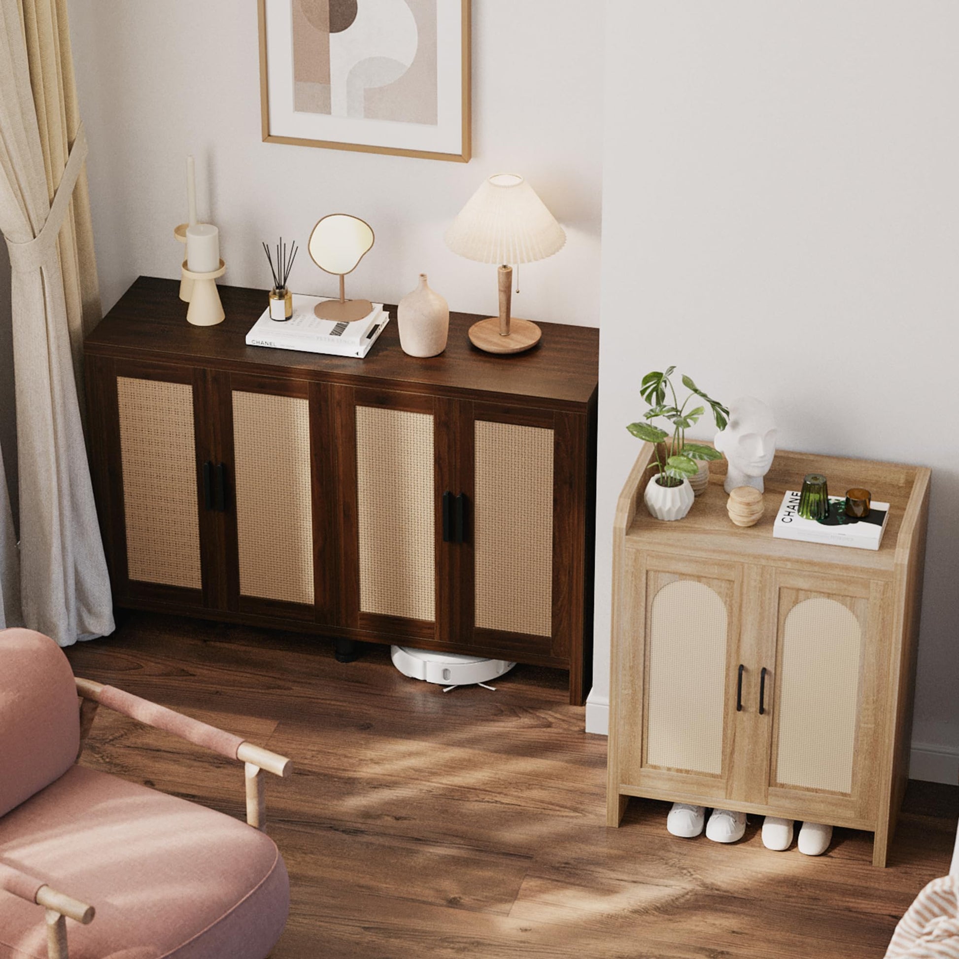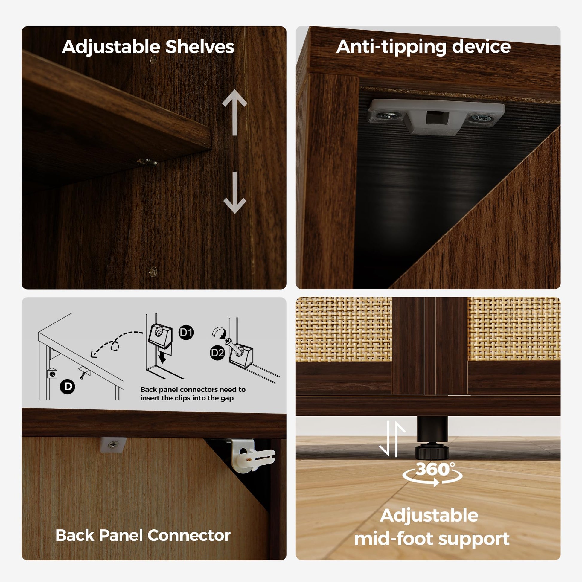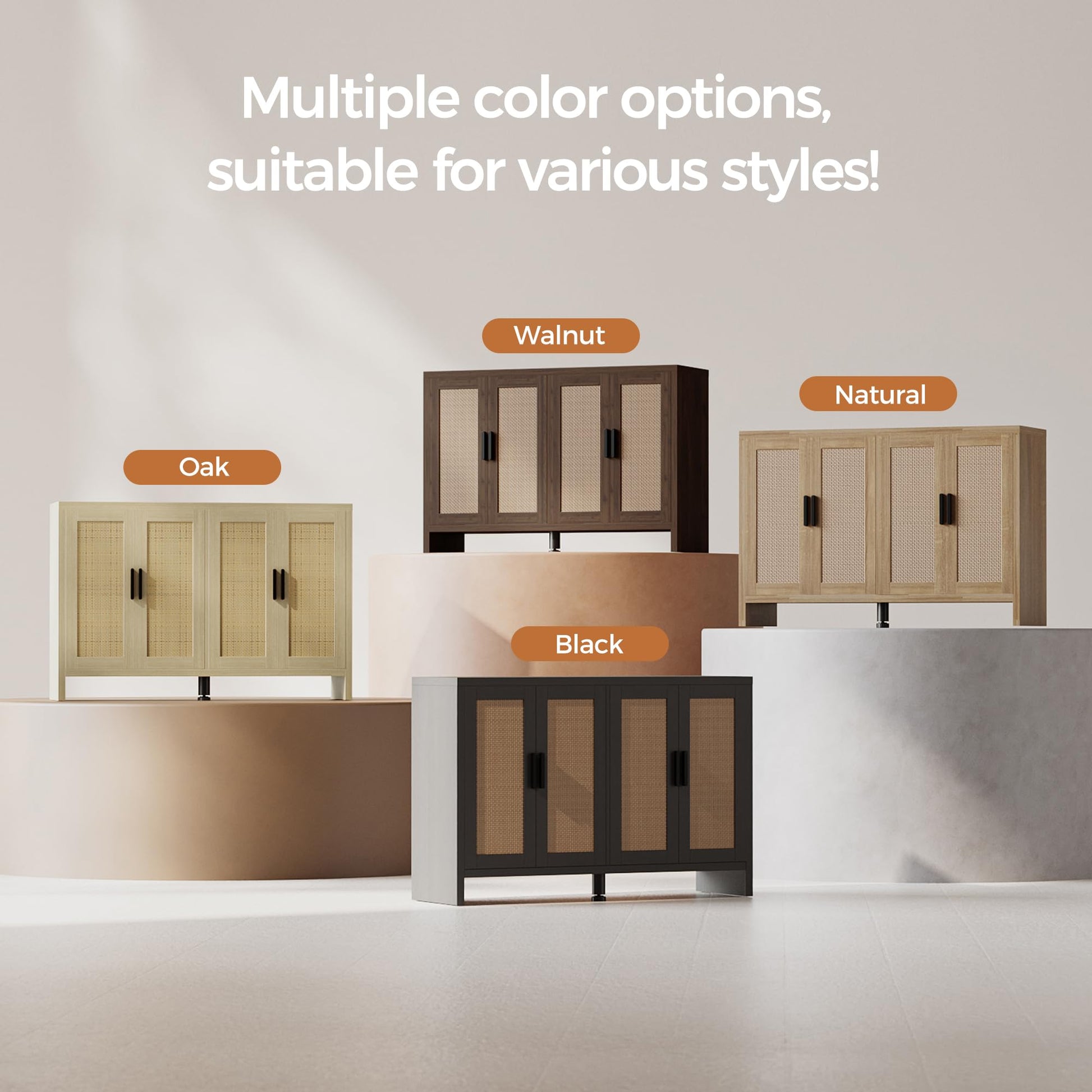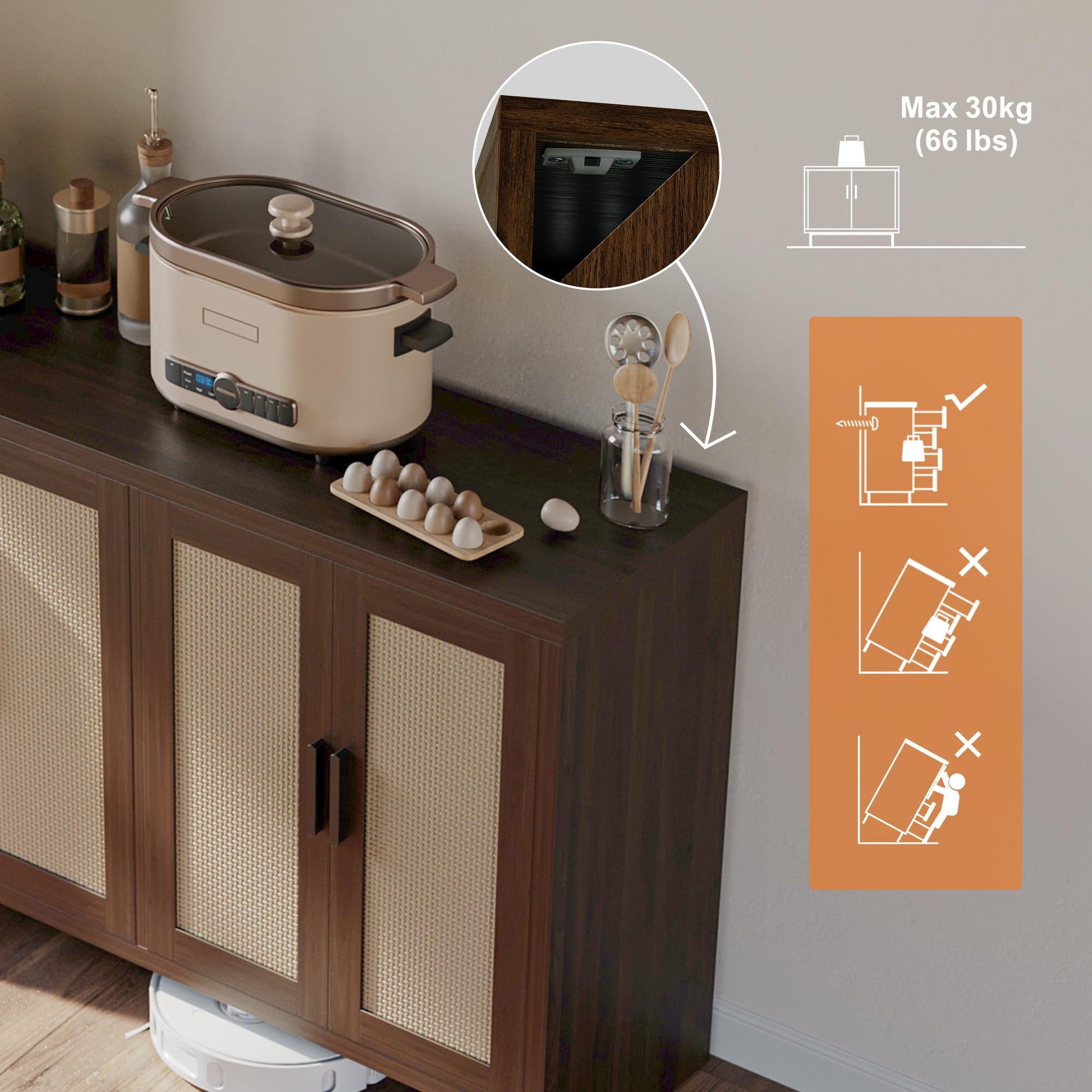 • 【Bohemian design】 This credenza storage cabinet is equipped with 4 design rattan wood doors, kitchen sideboard with black metal handles, adding a unique sense of fashion and charm to the product. The spacious top countertop can be used as a cooking table or to store tableware, etc., keeping the kitchen clean and tidy.