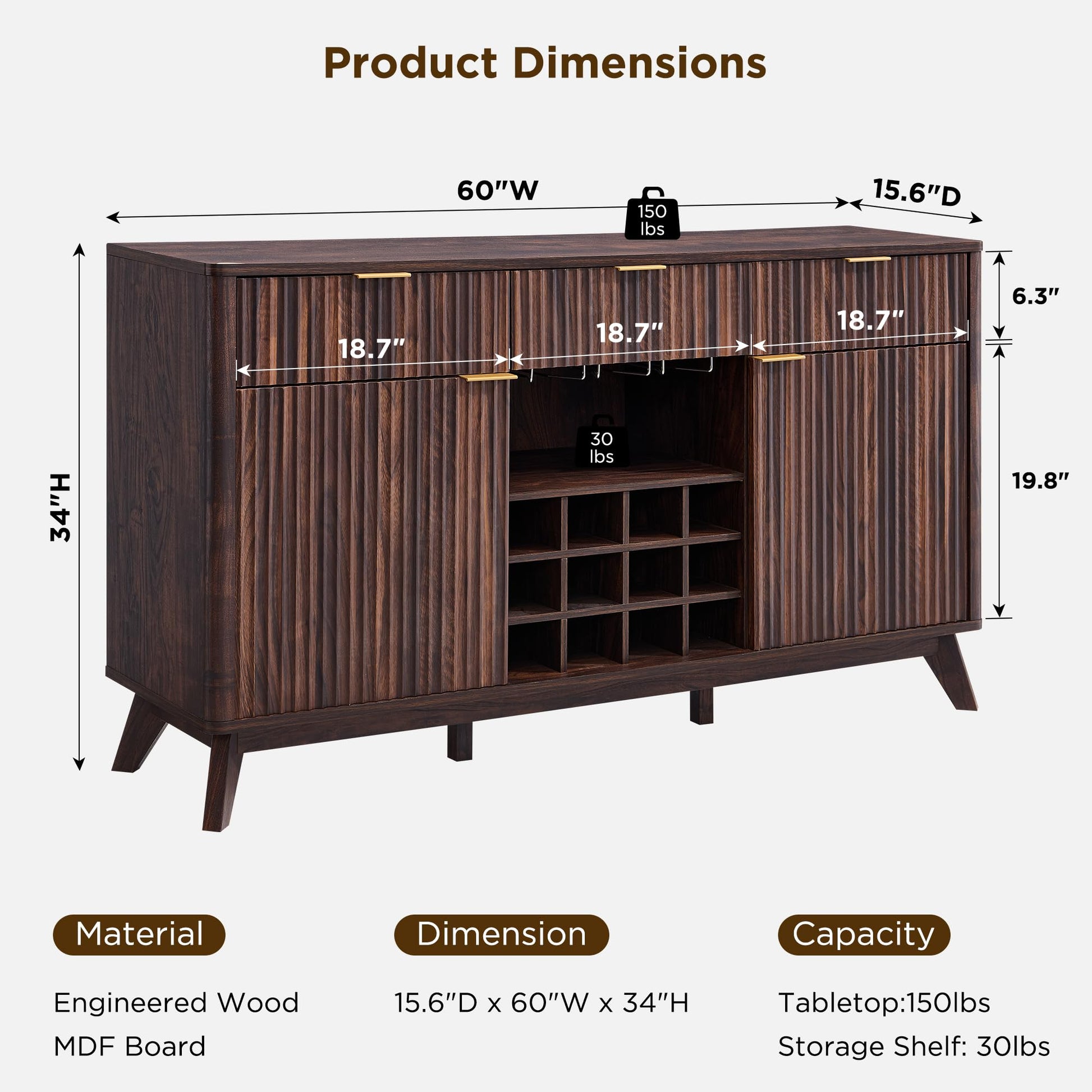60" Fluted Buffet Cabinet with 3 Drawers and 2 Doors, Modern Wine and Coffee Bar Sideboard with Wine and Glass Racks, Adjustable Shelves for Kitchen or Dining, Walnut