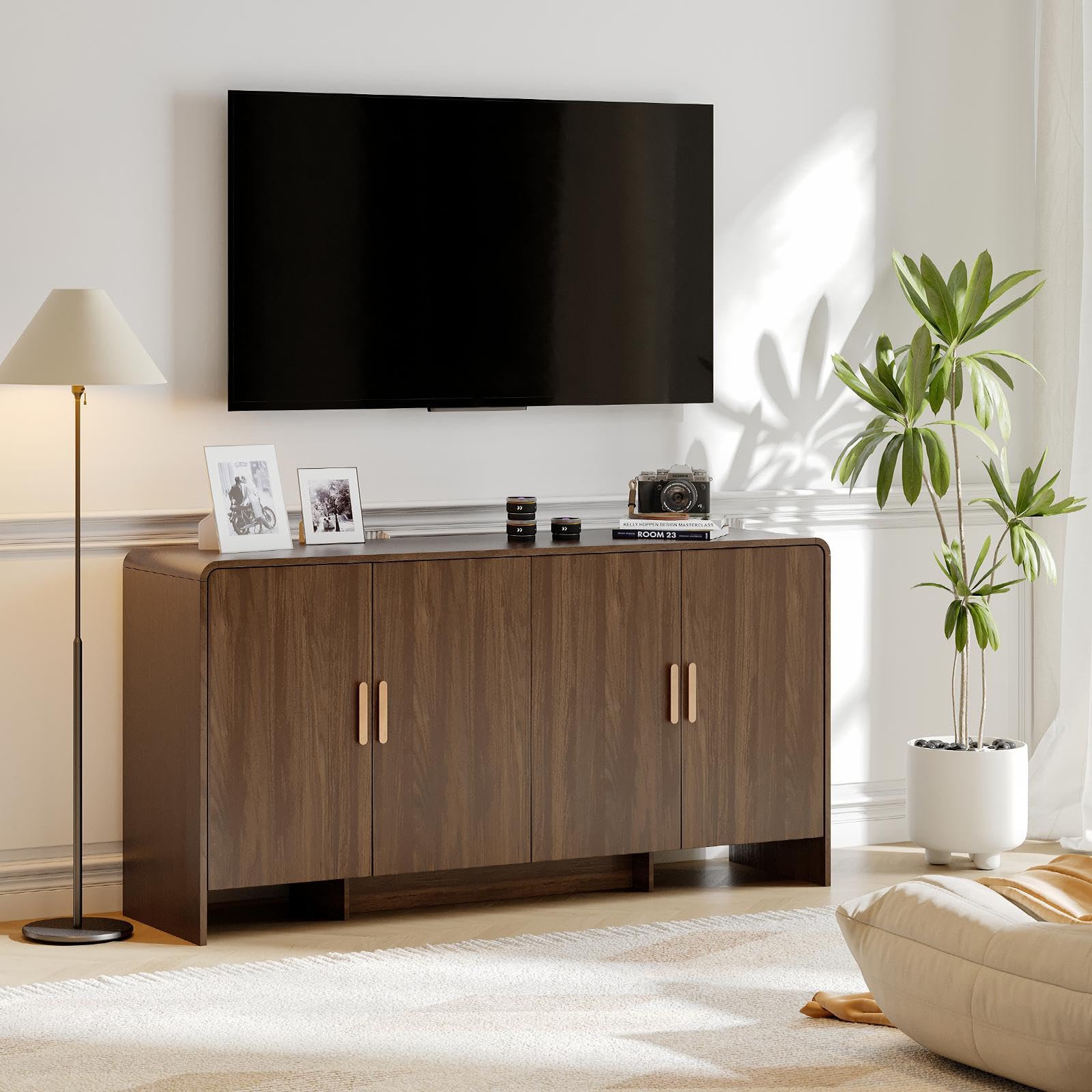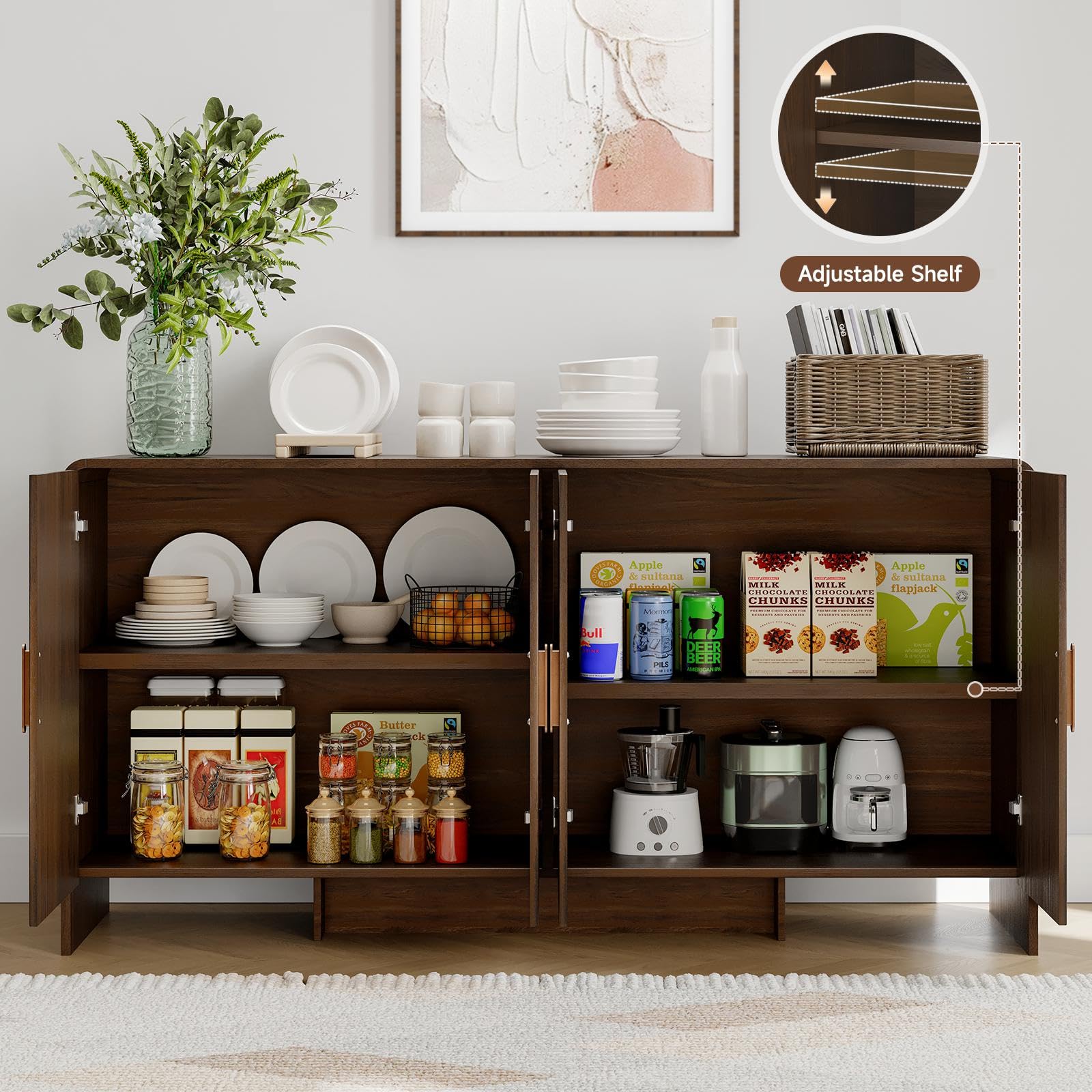 60" Curved Sideboard Buffet Cabinet with 4 Doors and Adjustable Shelves, Farmhouse Coffee Bar Storage for Living Room, Kitchen, or Hallway, Walnut