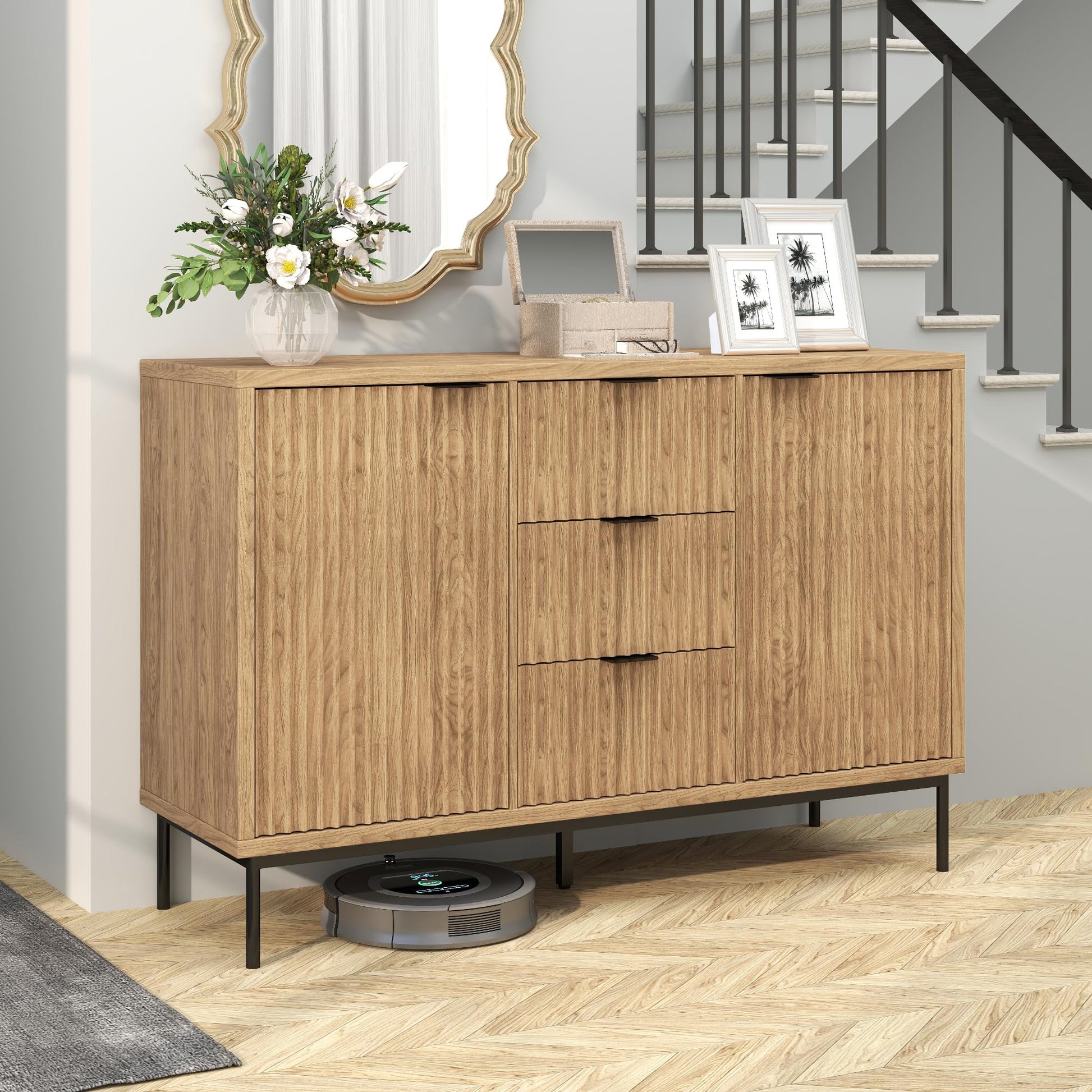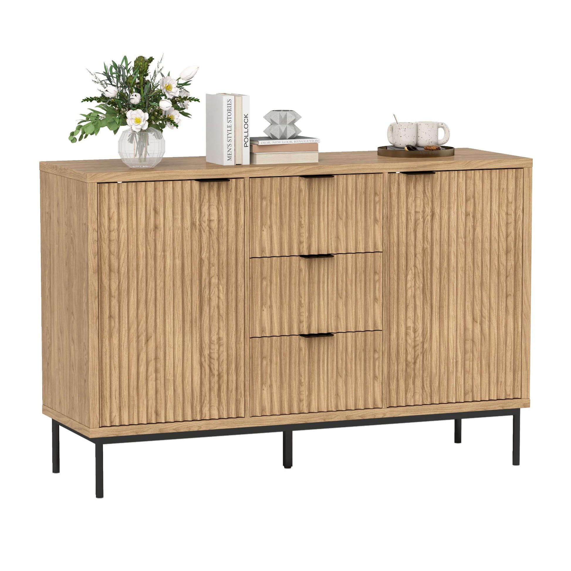 **Real Relax Sideboard Buffet Cabinet with Storage, Modern Fluted Sideboard with 2 Doors and 3 Drawers, Coffee Bar Accent Storage Credenza for Kitchen, Dining Room, and Living Room, Oak**