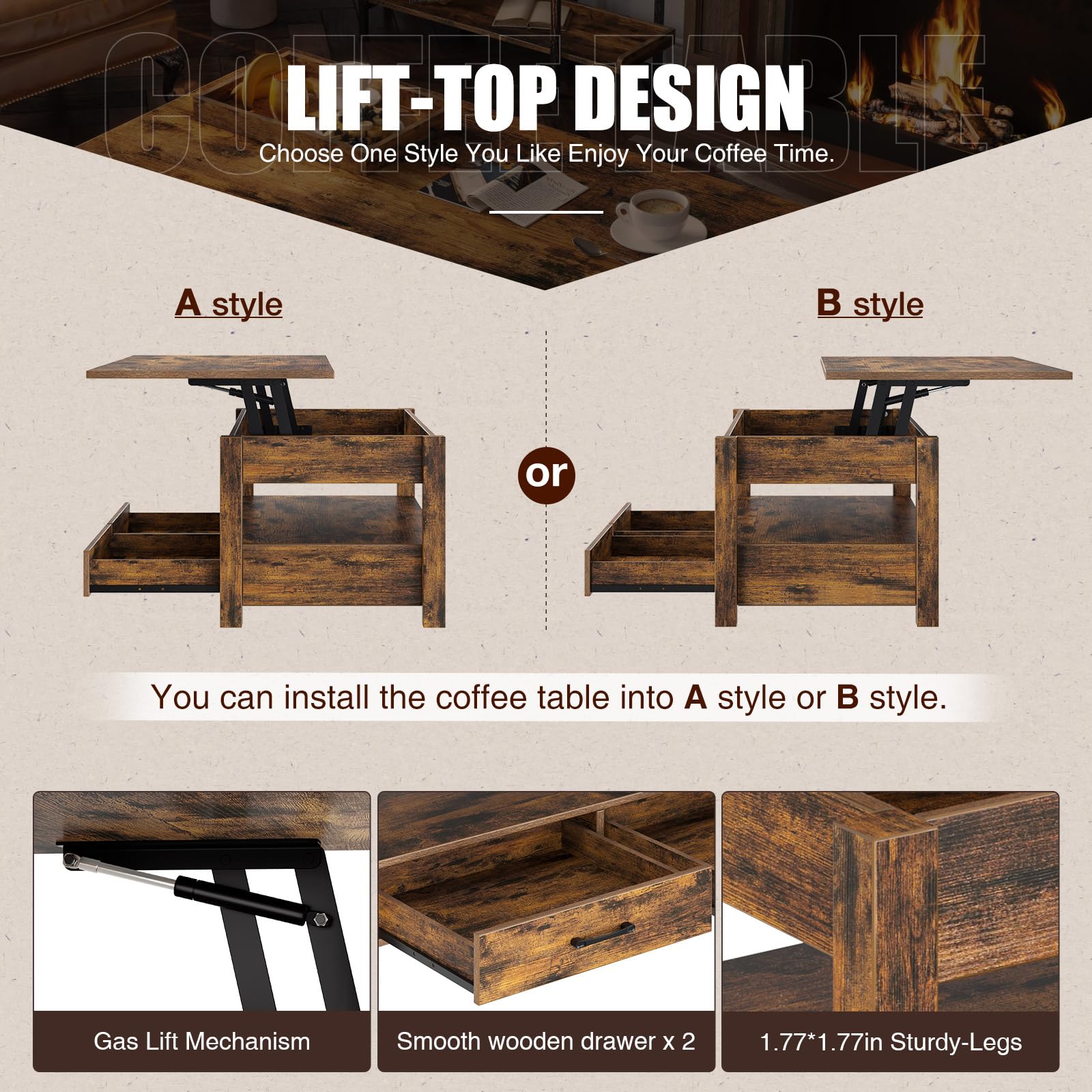- Lift-top Ergonomic Design - Is the height of other coffee table enough for you when sitting on sofa? The Rolanstar versatile wood flip top table provide you a floating raised work surface so you can comfortably sit and no longer need to lean forward. Retro industrial style coffee table fit for any room decor. Ideal for working, dining in living room