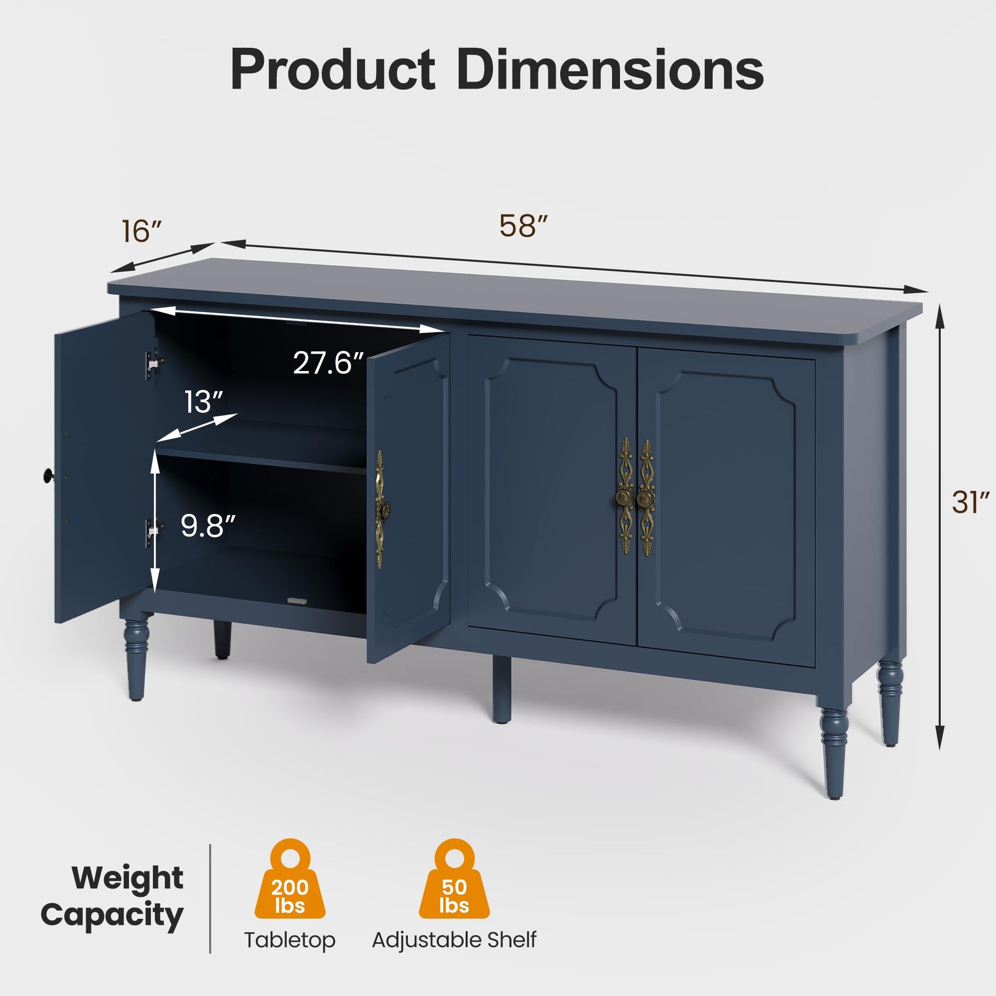 58" Mid-Century Modern Sideboard Buffet Cabinet with Storage and Solid Wood Legs, 4-Door Credenza for Entryway, Kitchen, or Living Room, Dove Gray