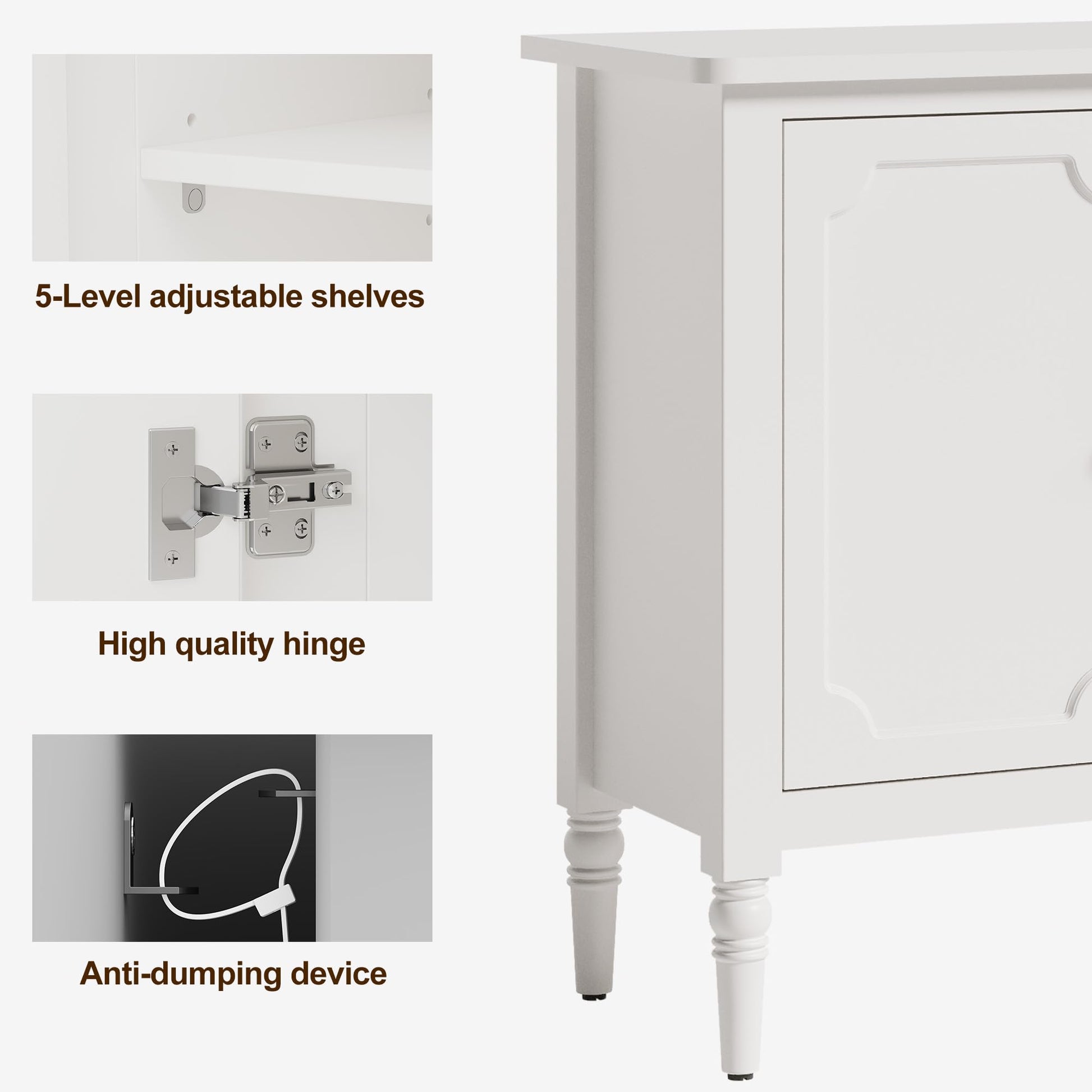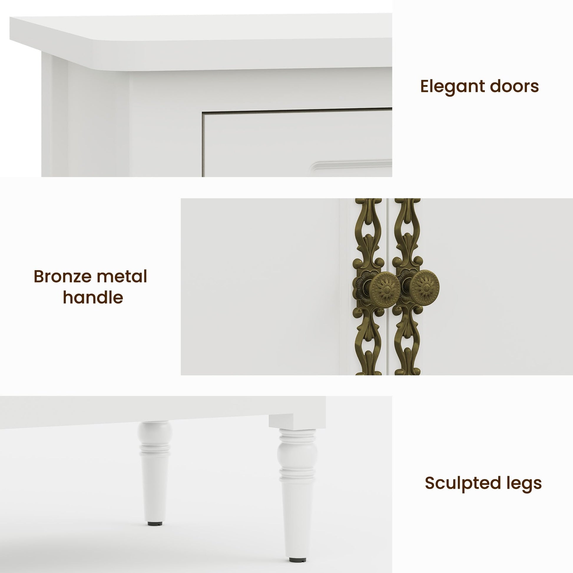 • 【Exuding Elegance & Sophistication】- This decorative cabinet features intricately carved antique bronze handles paired with graceful solid wood legs. Enhanced by a smooth eco-friendly finish and rounded corner detailing, it embodies refined authority from every perspective - whether admired from afar or examined closely, effortlessly elevating your living space with timeless grace and noble charm.