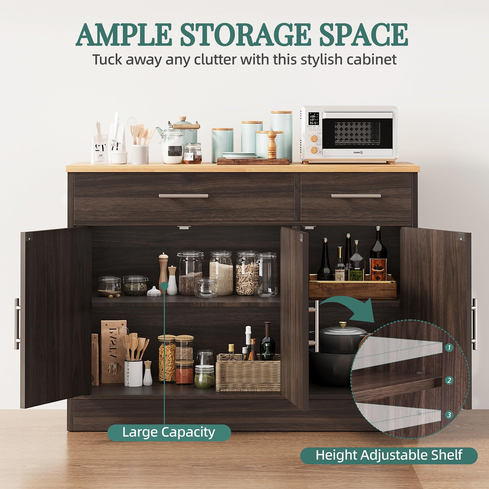 • Large Storage Space Cabinet: The buffet cabinet incorporates both open and closed storage space to meet your different needs. Spacious tabletop can place items for easy access, three handy drawers help classify knives and forks neatly, while two bottom cabinets each with internal shelf offer smart space to accommodate mugs, extra dishware, and other essentials.
