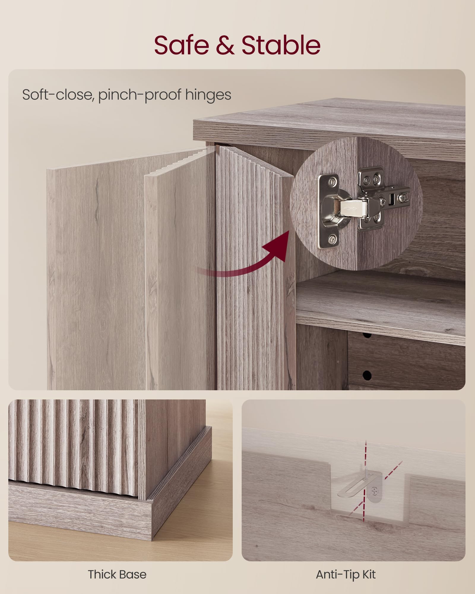 - Enhanced Safety: Soft-close hinges prevent slamming and pinched fingers, while the anti-tip kit ensures the kitchen buffet stays stable. The 15.8"D x 58.3"W x 31.5"H buffet cabinet keeps your home secure