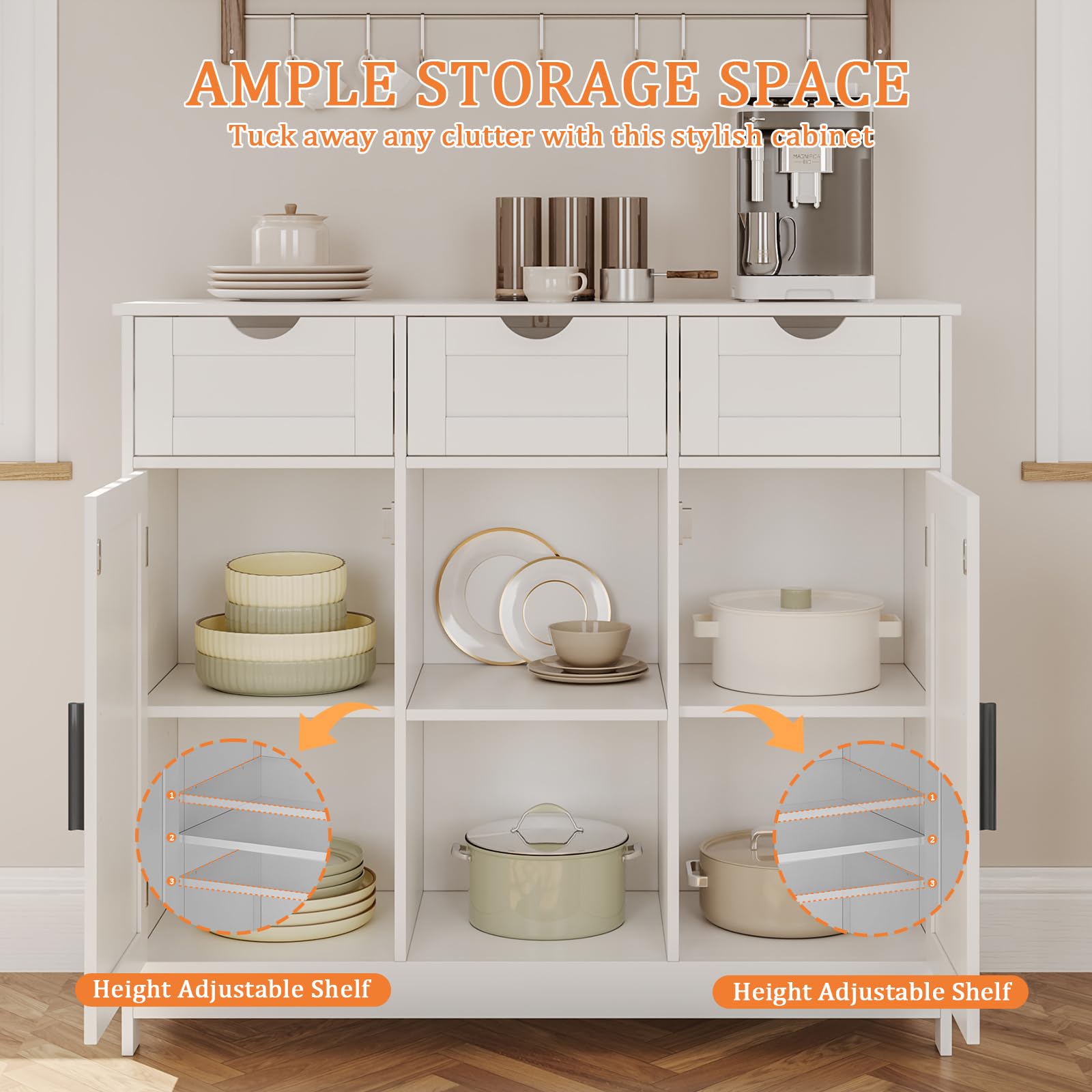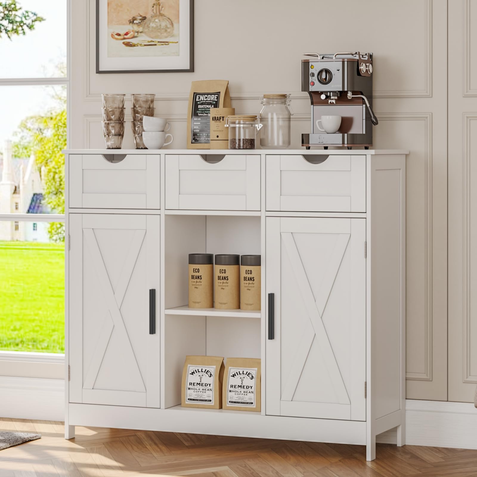 Storage Cabinet with 2 Doors, 3 Drawers, and 2 Adjustable Shelves, Coffee Bar Sideboard for Bathroom, Kitchen, or Living Room, White