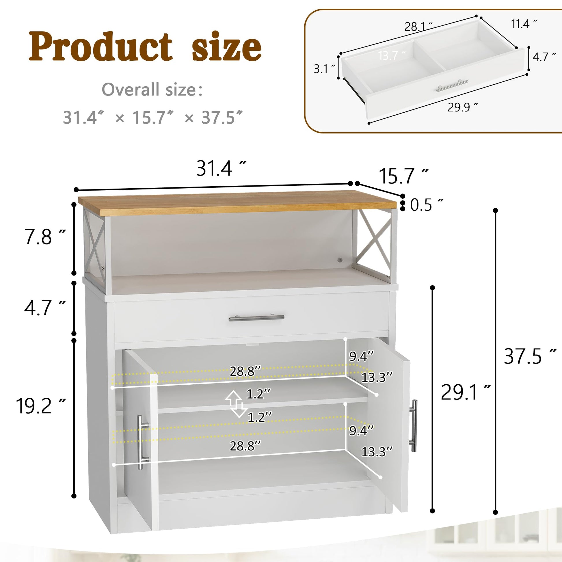 - PRODUCT DIMENSIONS INFO: This kitchen cabinet measures 31.4 "W x 15.7" D x 37.5 "H. Drawer size (inside): 29.9 "W x 11.4" D x 3.1 "H. Extra open storage shelf size: 31.4 "W x 15.7" D x 7.8 "H.