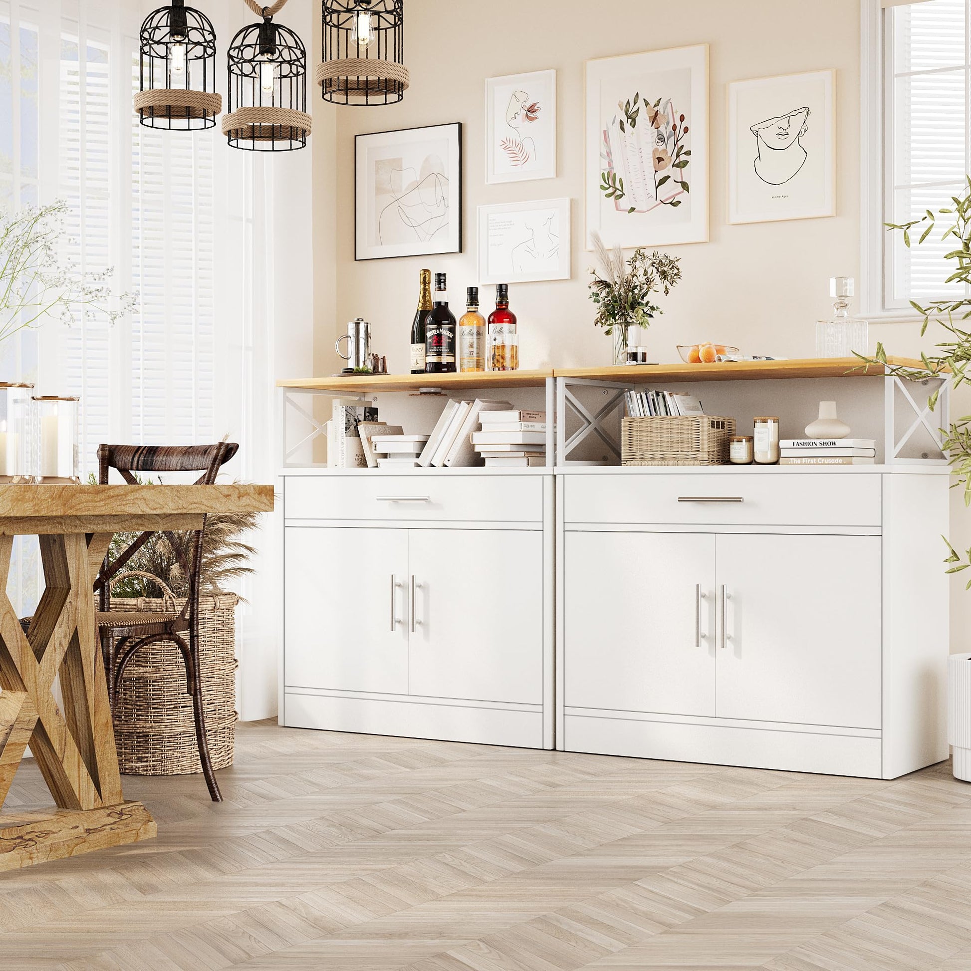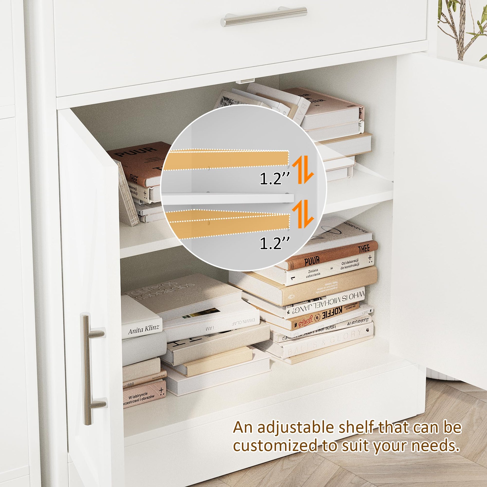 - VERSATILE STORAGE: This sideboard buffet cabinet provides enough storage space with drawer, doors and open shelf to to display and organize your kitchen items. The shelf inside is 3-level adjustable to meet various storage needs.