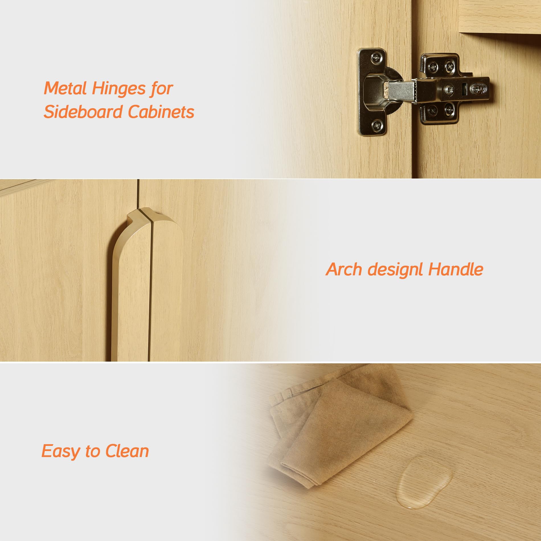 • Rounded Handles & Adjustable Shelves: With unique rounded handles and smooth curved edges, this modern sideboard adds a soft, refined aesthetic. Each cabinet features a built-in shelf that can be adjusted to three different heights, making it easy to store items of varying sizes—from tall pitchers to small plates.