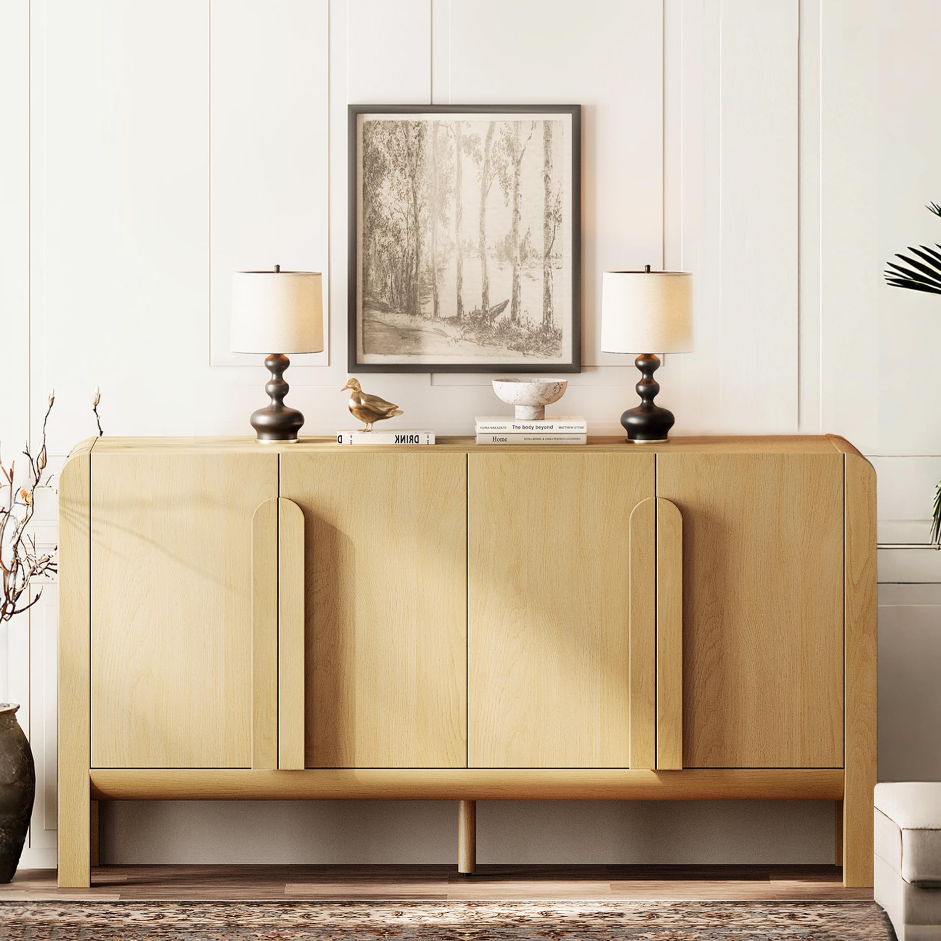 • French Vintage Style & Arched Design: Finished in light wood tones, this farmhouse sideboard brings a warm, With unique rounded handles and smooth curved edges, this modern sideboard adds a soft, refined aesthetic.Vintage vibe while maintaining clean modern lines. Ideal as a wooden cabinet for living rooms, kitchens, or entryways.