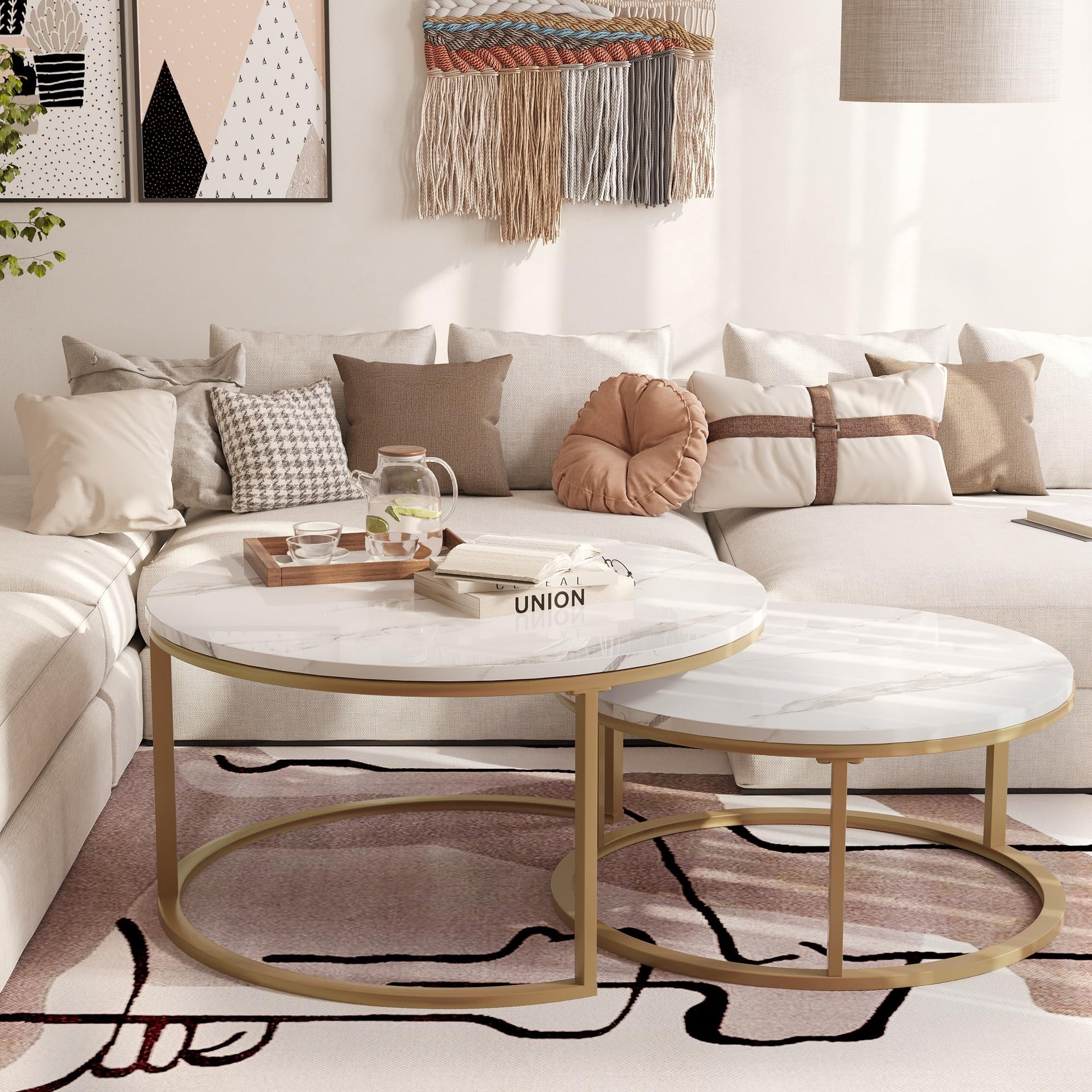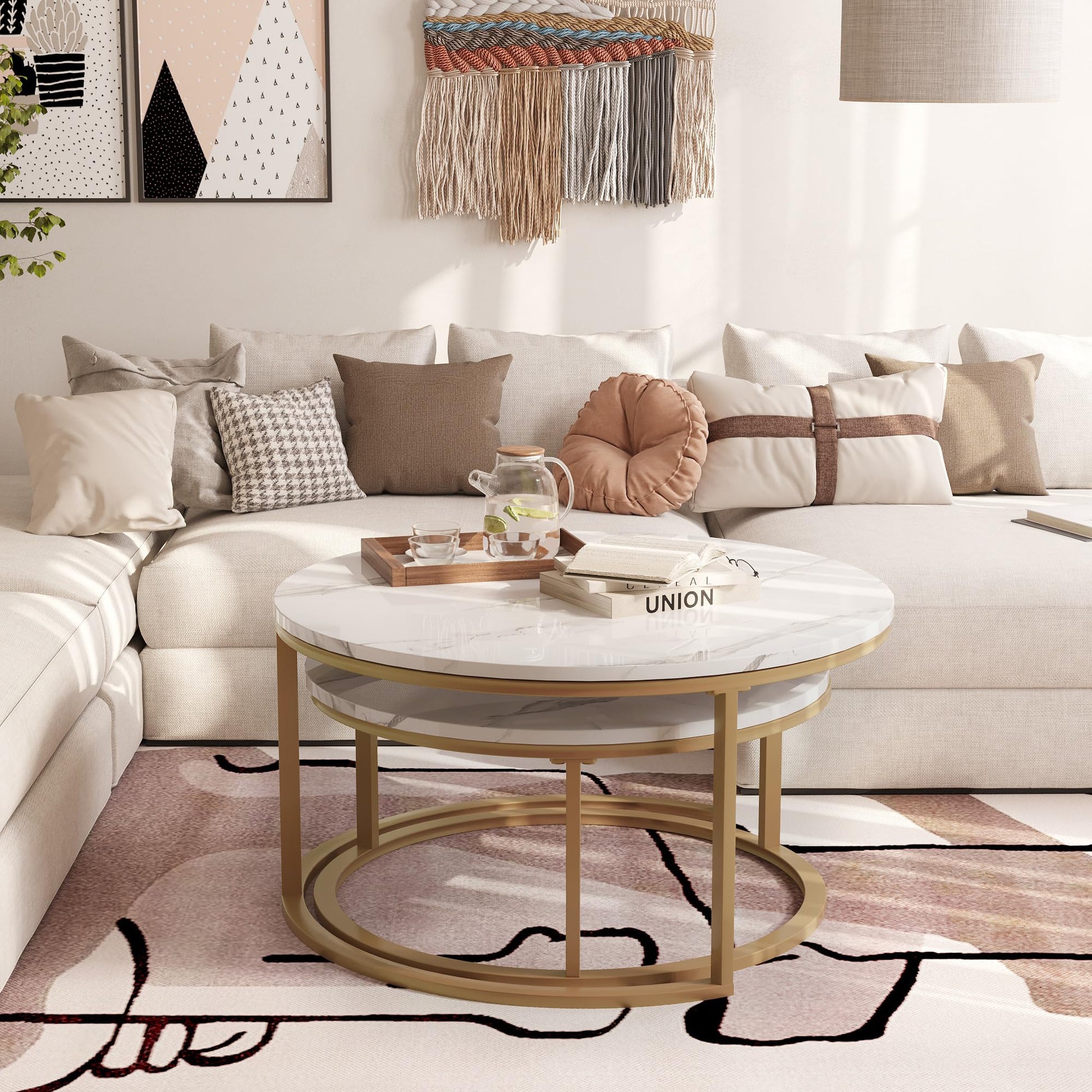 WiberWi Round Nesting Coffee Tables Set of 2 – Large Ø34", Small Ø26", Modern Gold Metal Frame Circle Tables with High Gloss Faux White Marble Top for Living Room