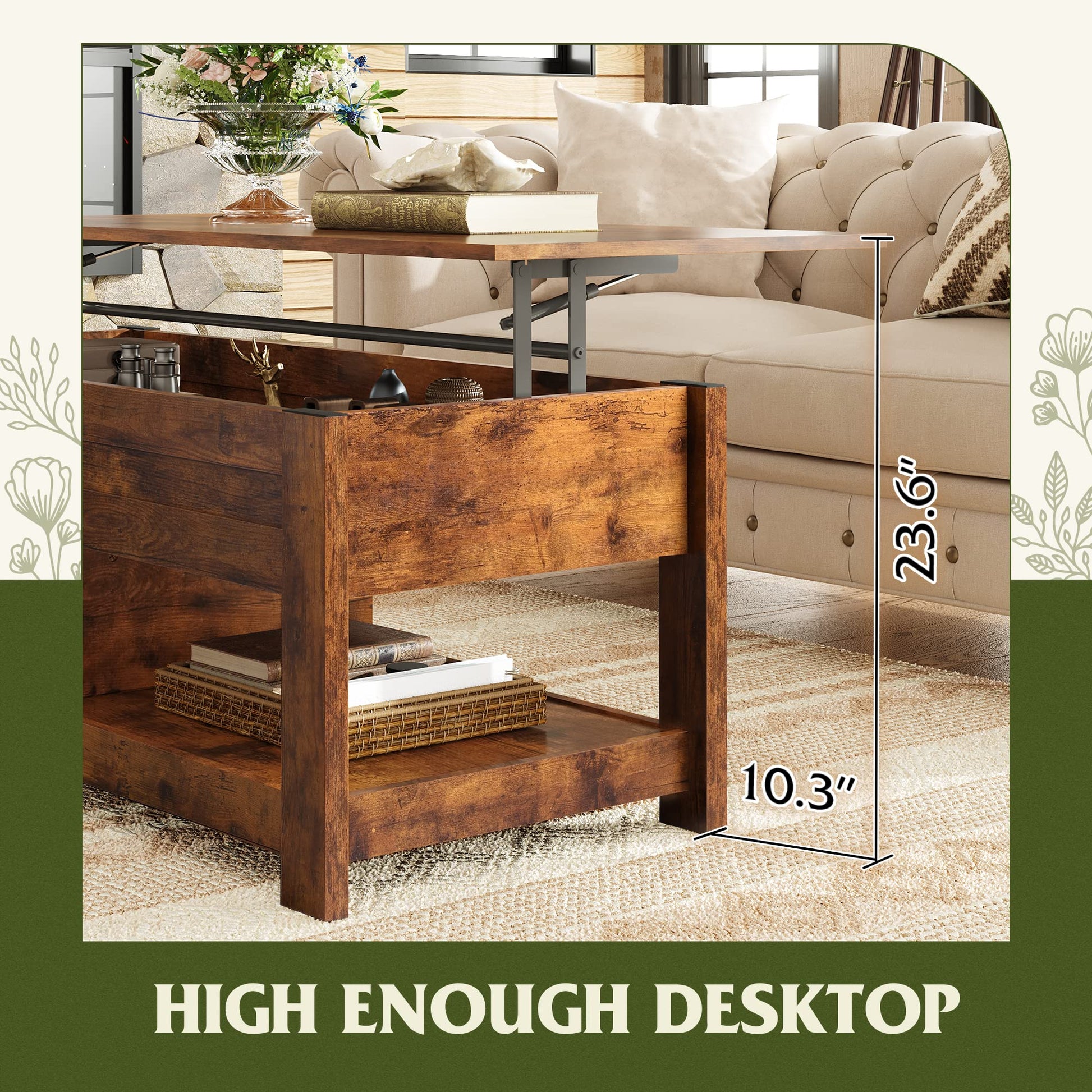 WLIVE 47" Lift Top Coffee Table with Hidden Compartment and Dual Storage Shelves – Rustic Brown Modern Center Table for Living Room, Spacious Storage with Functional Lift-Top Design